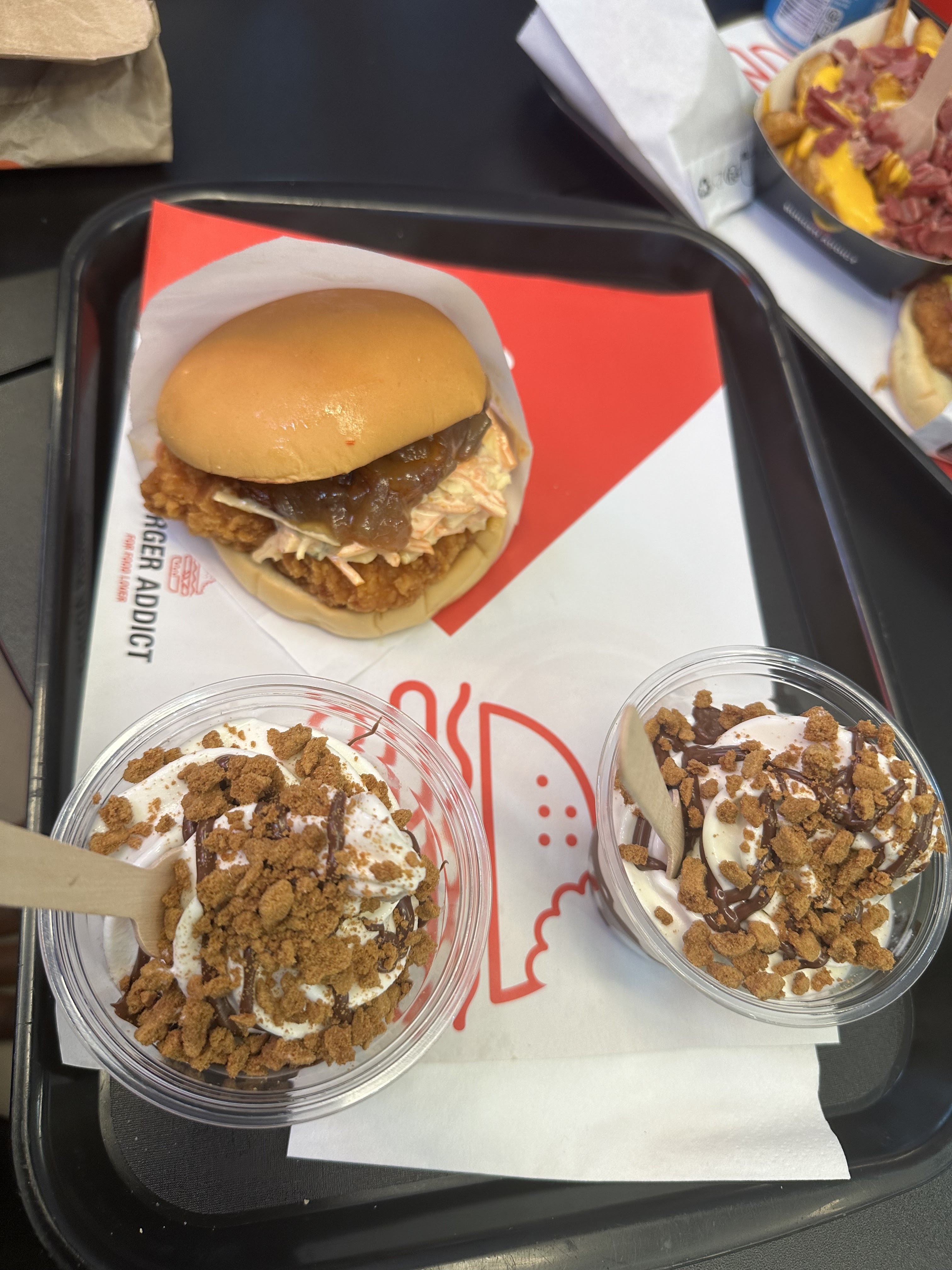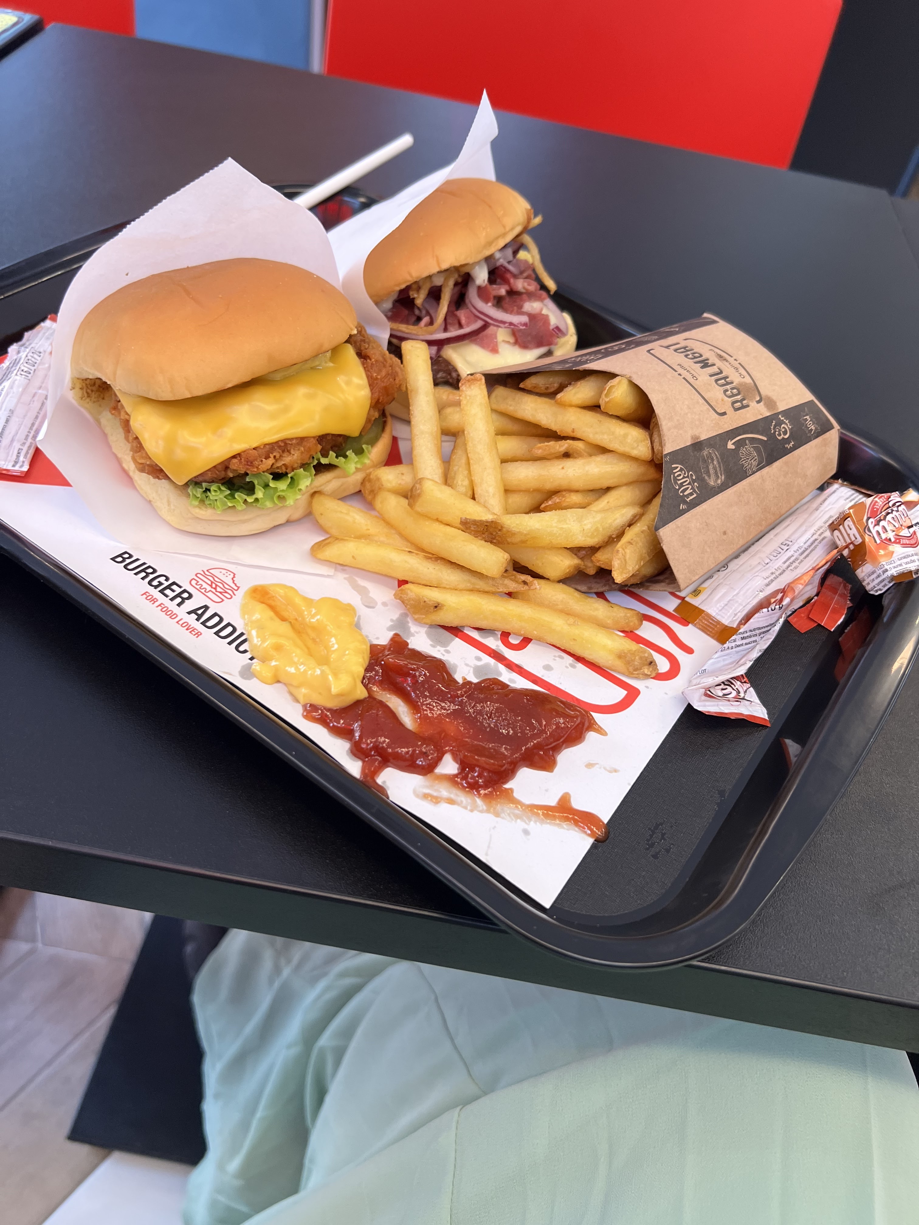 Étant de passage à Cergy, j'ai vu le flyer de Burger Addict et été immédiatement attirée par le burger au tender et banane plantain. De plus, avec l'offre black friday, j'ai également pris le burger chèvre miel tout ça pour le prix d'un menu avec un seul burger chez la concurrence. Je n'ai vraiment pas été déçue ! Les burgers et les frites sont juste EXCELLENTS !! Enfin le personnel est aux petits soins et j'ai dû fuir pcq leurs desserts, exposés comme des œuvres d'art, étaient trop tentants # Bref vivement que Burger Addict arrive à Lille 😋