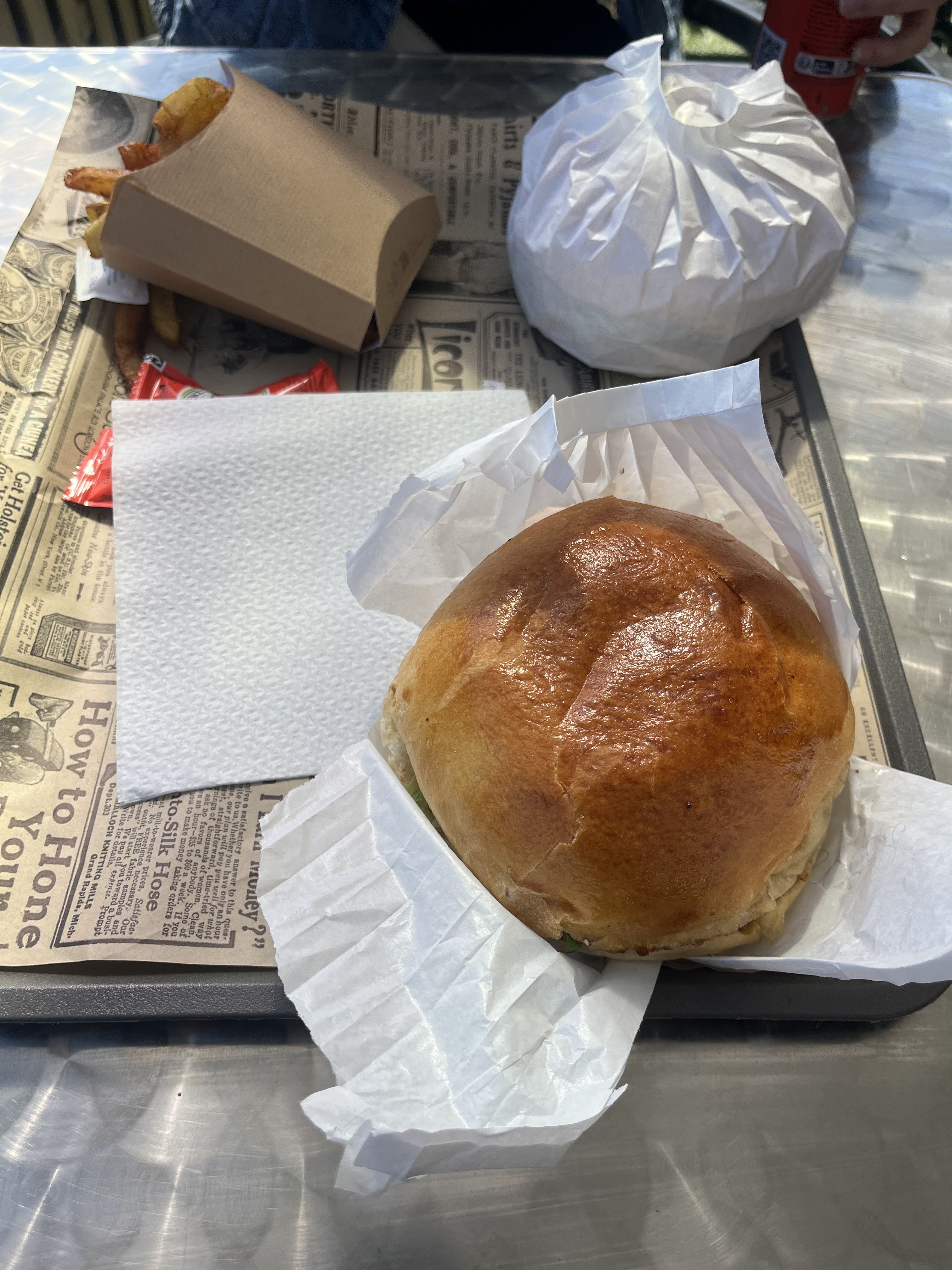 Nous avons entendu des éloges sur leurs hamburgers, réputés être les meilleurs, et avons donc décidé de les essayer. Résultats : le goût était bon, mais les frites étaient extrêmement dures, comme si elles dataient de la veille. Nous avons payé 45 euros pour trois hamburgers et des frites qui ont fini à la poubelle. Nous sommes vraiment déçus.