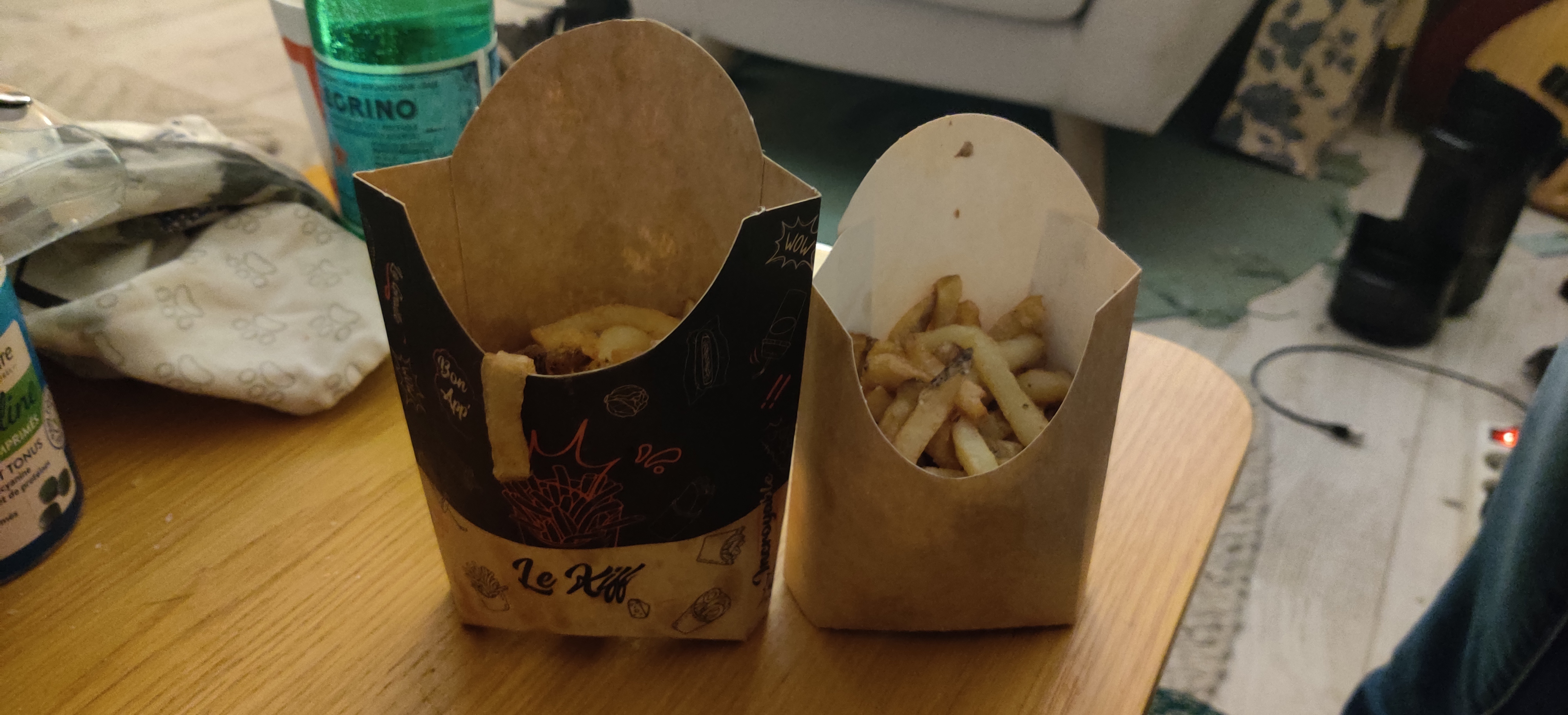 Clients ponctuels, ce sera notre dernière commande : le service s’est dégradé, avec des livraisons longue, plus de 1h15 pour 2 burgers à 1,7 km, donc arrivés froids, avec le cheddar des frites durci dans la boite (donc difficile à récupérer au four). C’est souvent la galère pour recevoir la commande, nous passerons notre tour … tant pis.