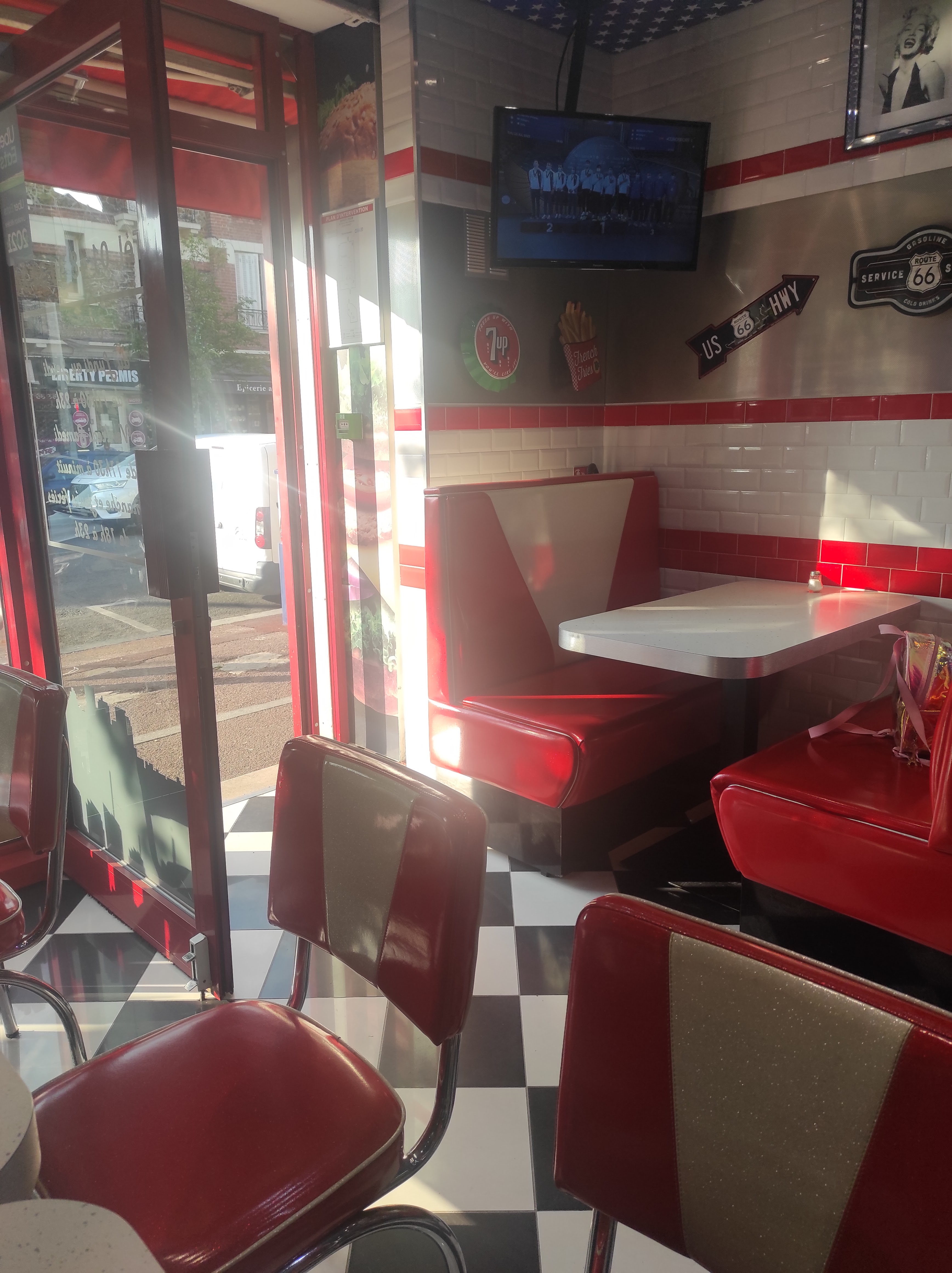 Endroit parfait et magique. J'y suis allé en famille samedi 4 mai midi, nous etions 9 et c'etait parfait. Vraie apbiance d'un diner americain des annees 50, hygiene impeccable personnel chaleureux et d'une amabilité extreme. Meme ma vieille maman de 80 ans a beaucoup aimé. Vraie burger des années 50 avec viande halal mais ouvert à toutes les communautés. Viande fraiche frite maison cheddar fondant. Vraiment j'encourage tout le monde à y aller. J'y ai passé un très bon moment