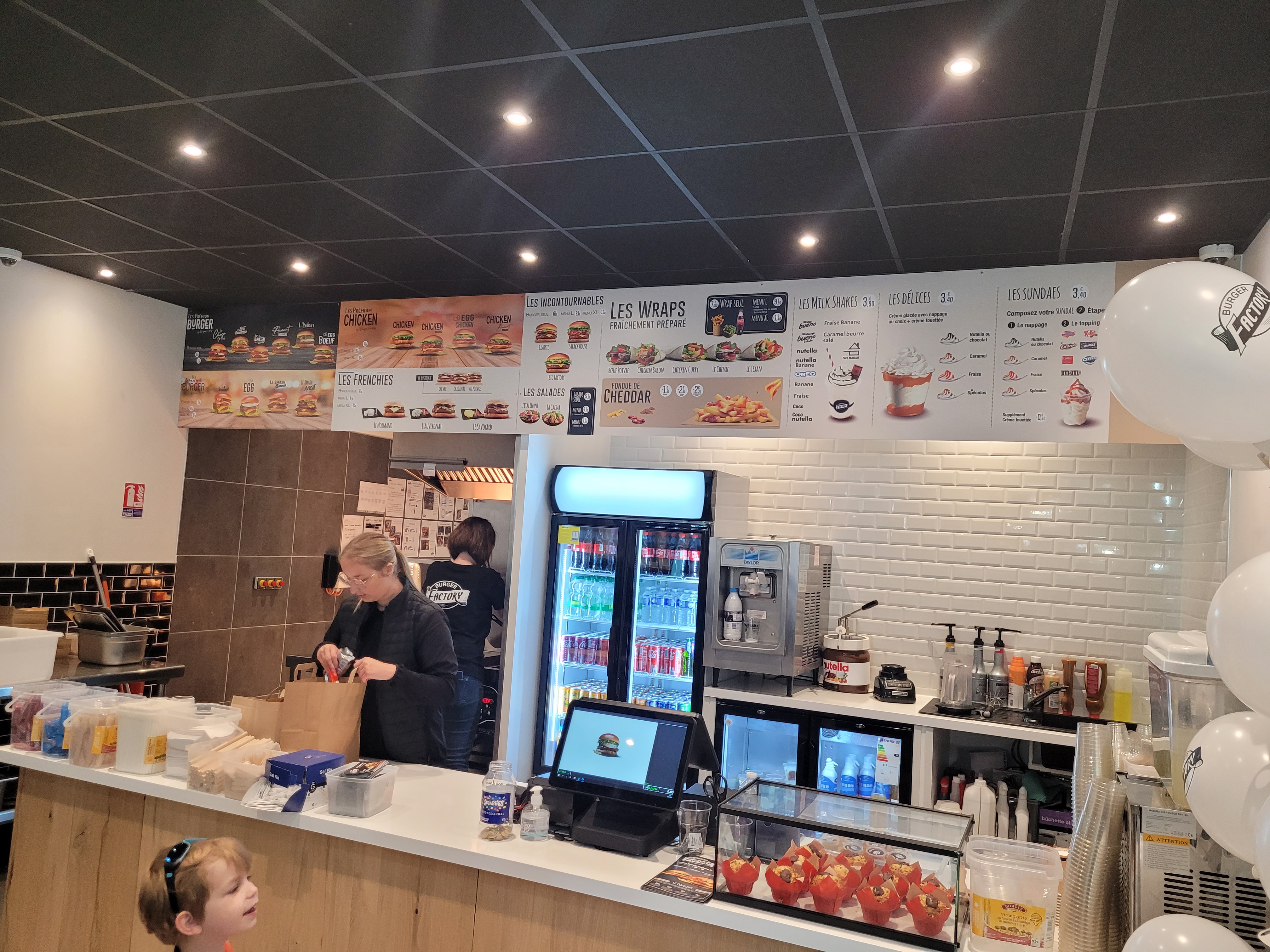 Interface de la borne pas très esthétique Dommage qu'il faut commander sur une borne on perd le contact humain ça copie les fast food Bon burger 🍔 mais je trouve la portion un peu léger plus de frites ou plus de viande serait parfait sinon très bonne viande Dommage qu'il y ait 2 cuisine une à l'entrée et une au fond ça serait mieux de les rassembler
