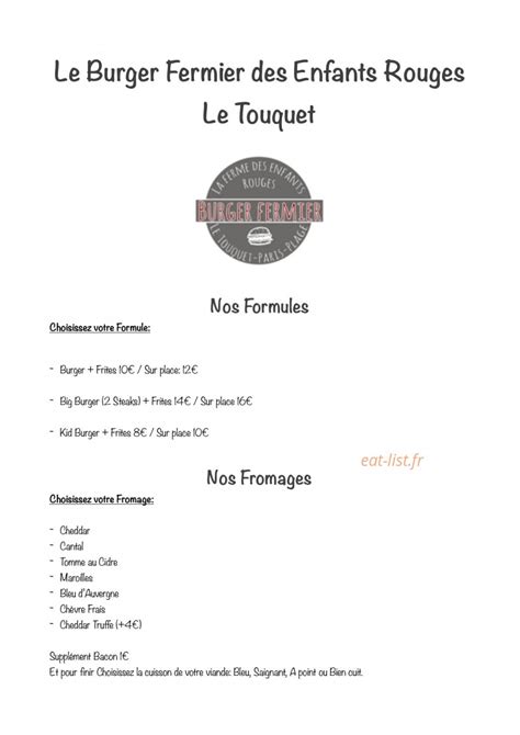 Voici toutes les informations sur le Restauration rapide Burger fermier des Enfants Rouges qui ce trouve au 49 Rue de Calais, 62520 Le Touquet-Paris-Plage (62). Sur cette fiche vous trouverez les photos, l'adresse, les horaires d'ouverture, le numero de téléphone et les avis clients.Vous pouvez églement rédiger un avis si vous le souhaitez en bas de page.