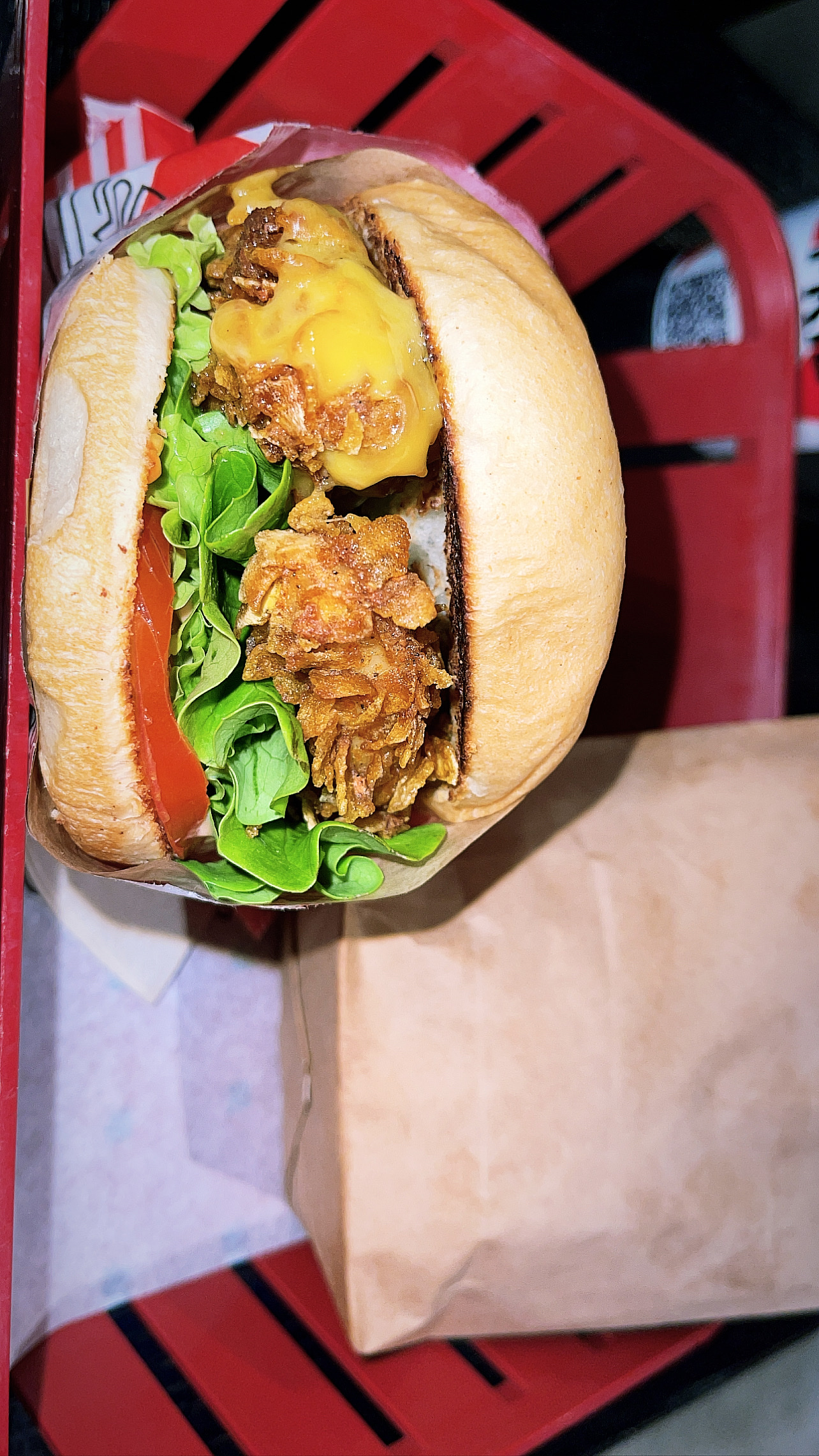 La nourriture était bonne. Chaud et arrivé frais. Les filets de poulet étaient très savoureux et croustillants ! Si vous souhaitez commander le burger au poulet, je vous recommande de ne pas commander les filets de poulet, car la galette de poulet burger ne contient que deux filets. Les boissons et les sauces sont illimitées, très faciles à monter et à remplir à votre guise. Les toilettes et le restaurant pourraient éventuellement nécessiter un peu de nettoyage.