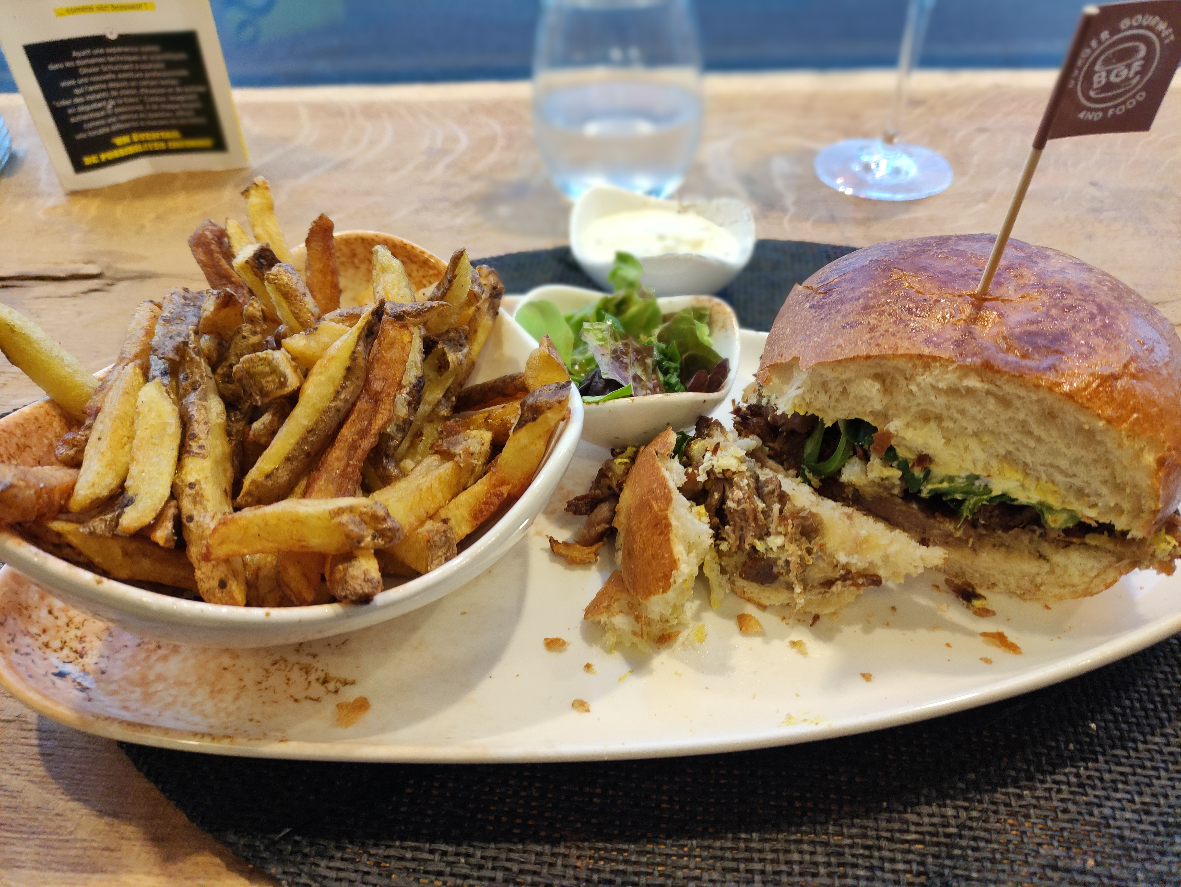 Assis à notre table à 20 h10, commande faite dans les 15 min, l'assiette est arrivée à 21h30. Non non, il n'y a pas d'erreur, 1 h20 à attendre. On est resté poli car ça vient d'ouvrir, mais le Burger est juste correct, le pain est sec, les pichets d'eau sont là pour pousser. Pour finir, on entend les cuistots s'engueuler, bref, j'espère qu'ils vont s'améliorer rapidement, car pour aujourd'hui, 1 étoile, c'est déjà bien payé.