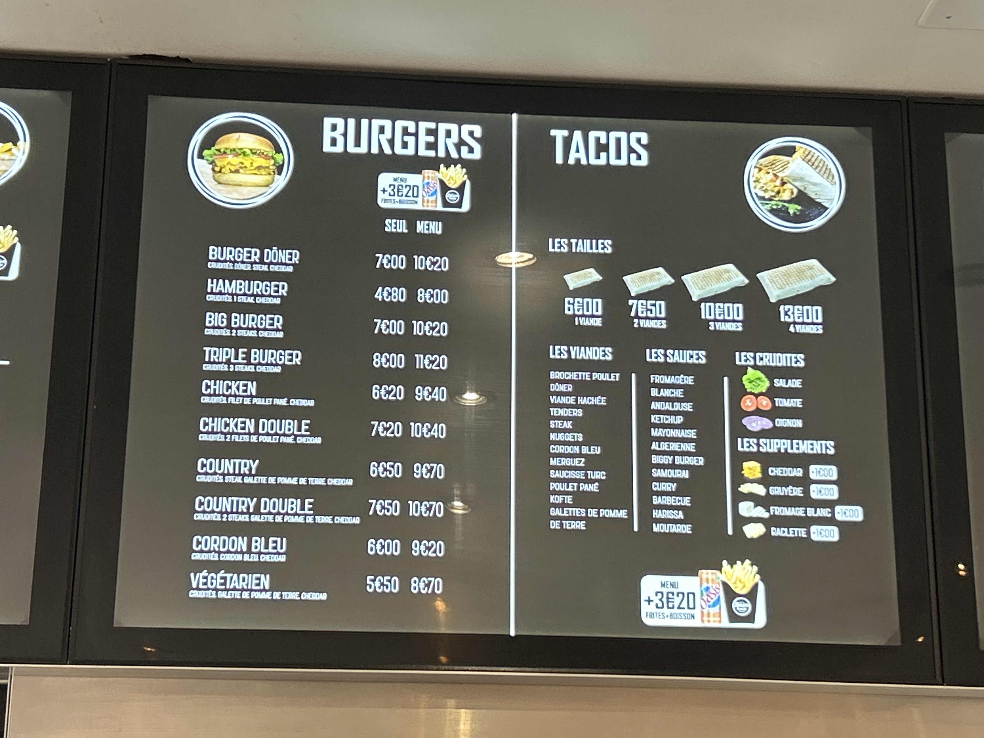 Je suis relativement content, rarement déçus , les burgers sont correctes , kebab aussi , qualité intermédiaire , bon rapport qualité-prix.