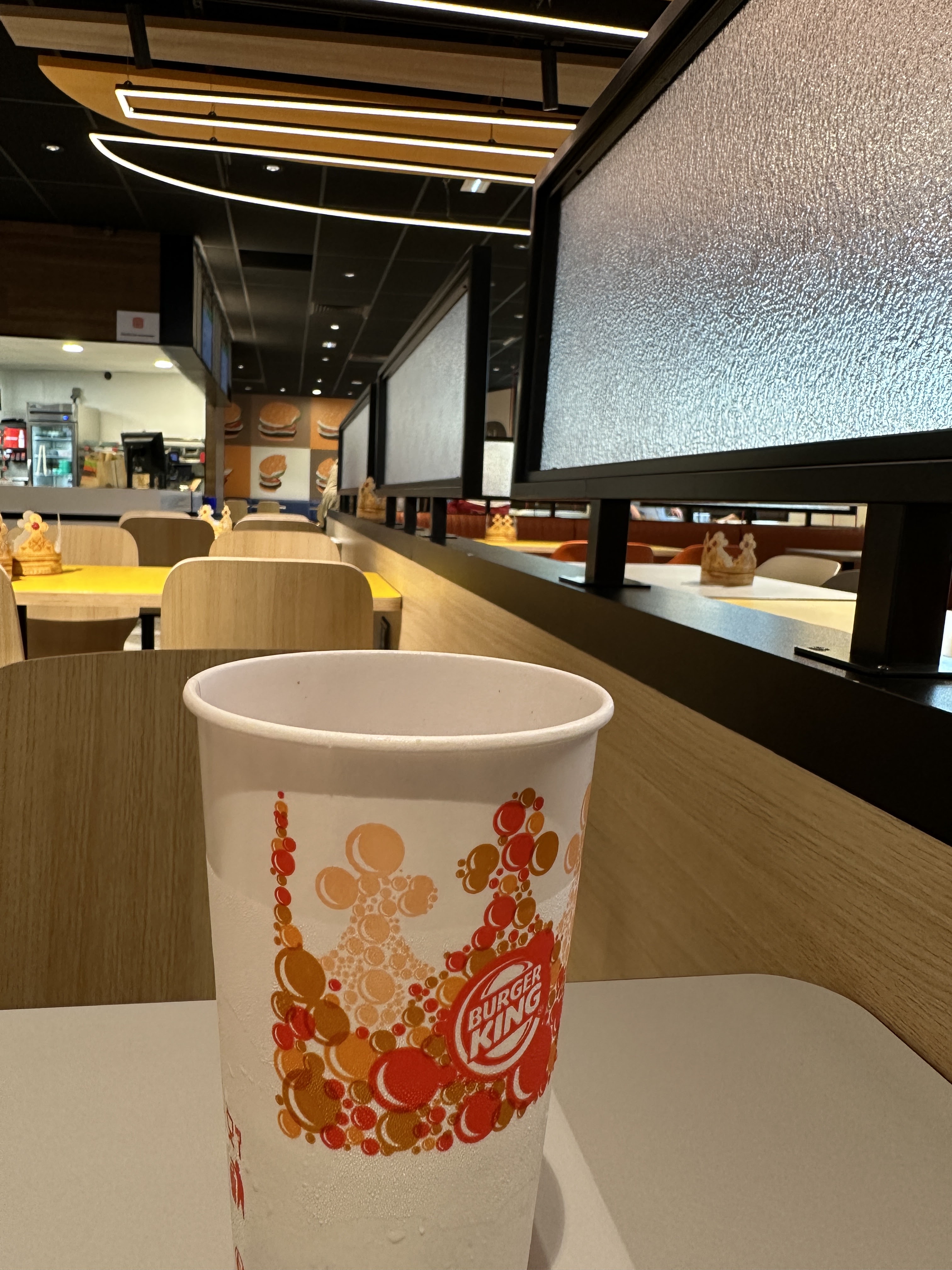 Il n'y a personne dans le burger king mais ils arrivent quand même à te donner des frites et des nuggets froides.. Décevant Et t'as l'impression d'être dans une boîte de nuit, la musique braille ...