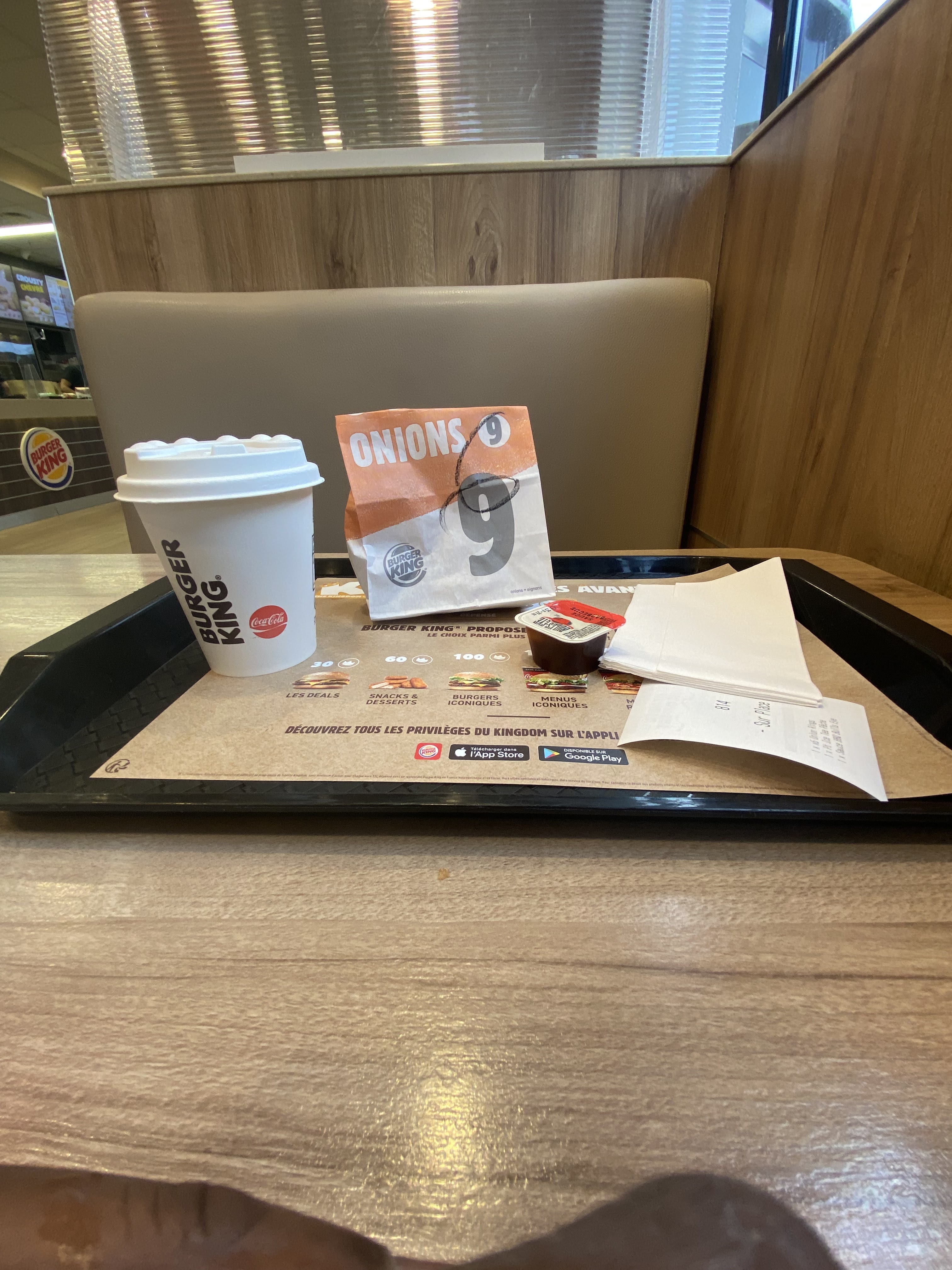 Il était 00h30 et tous les restaurants étaient fermés. Nous avons choisi Burger King, sachant qu'à cette heure-là, nos attentes étaient limitées. Les frites étaient correctes, mais le burger était moyen. Nous avons commandé un menu Bacon Lover et un Master Poulet. Nous étions déçus de trouver seulement une fine tranche de bacon dans notre burger, surtout avec un nom de menu qui promettait du bacon. Malgré tout, dans l'ensemble, notre expérience était meilleure que celle que nous avons eue dans certains autres fast-foods.