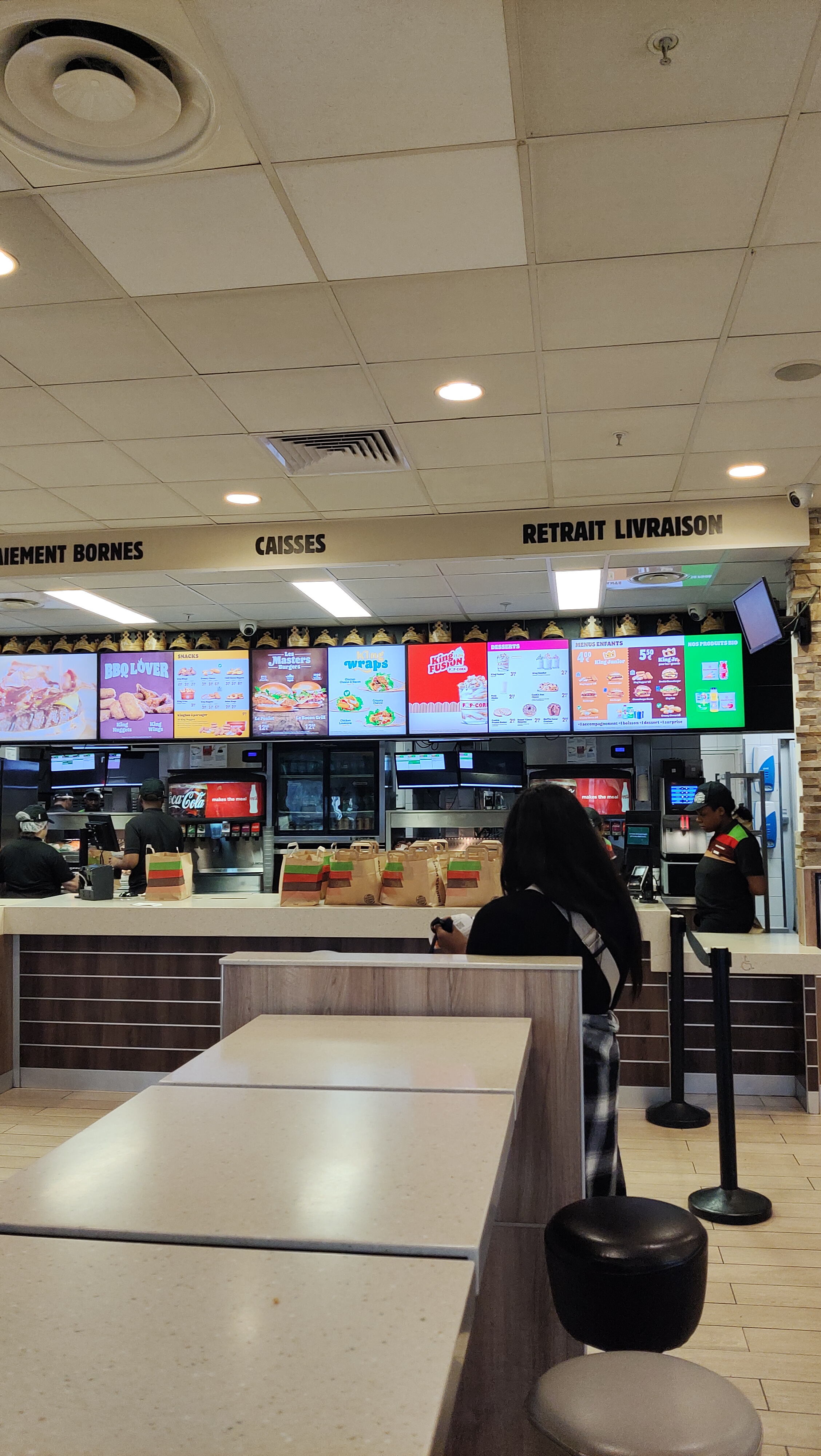 Je n'ai pas apprécié ce Burger King pour les raisons suivantes : Premièrement, l'espace était très restreint, les clients étaient entassés les uns sur les autres. Chaque fois qu'une personne passait dans les allées, il fallait demander aux personnes assises de se lever, ce qui rendait l'expérience peu confortable. De plus, les présentations des glaces à l'écran ne reflétaient pas du tout le produit une fois servi sur le plateau, ce qui était décevant. Les glaçons dans le Coca avaient un arrière-goût si désagréable que je n'ai pas pu le boire. En outre, une musique d'ambiance aurait été un plus, mais au lieu de cela, les serveurs appelaient les numéros de commande toutes les 15 secondes, ce qui était pénible. En somme, tant que ces problèmes ne seront pas résolus, je préférerai éviter ce Burger King à l'avenir.