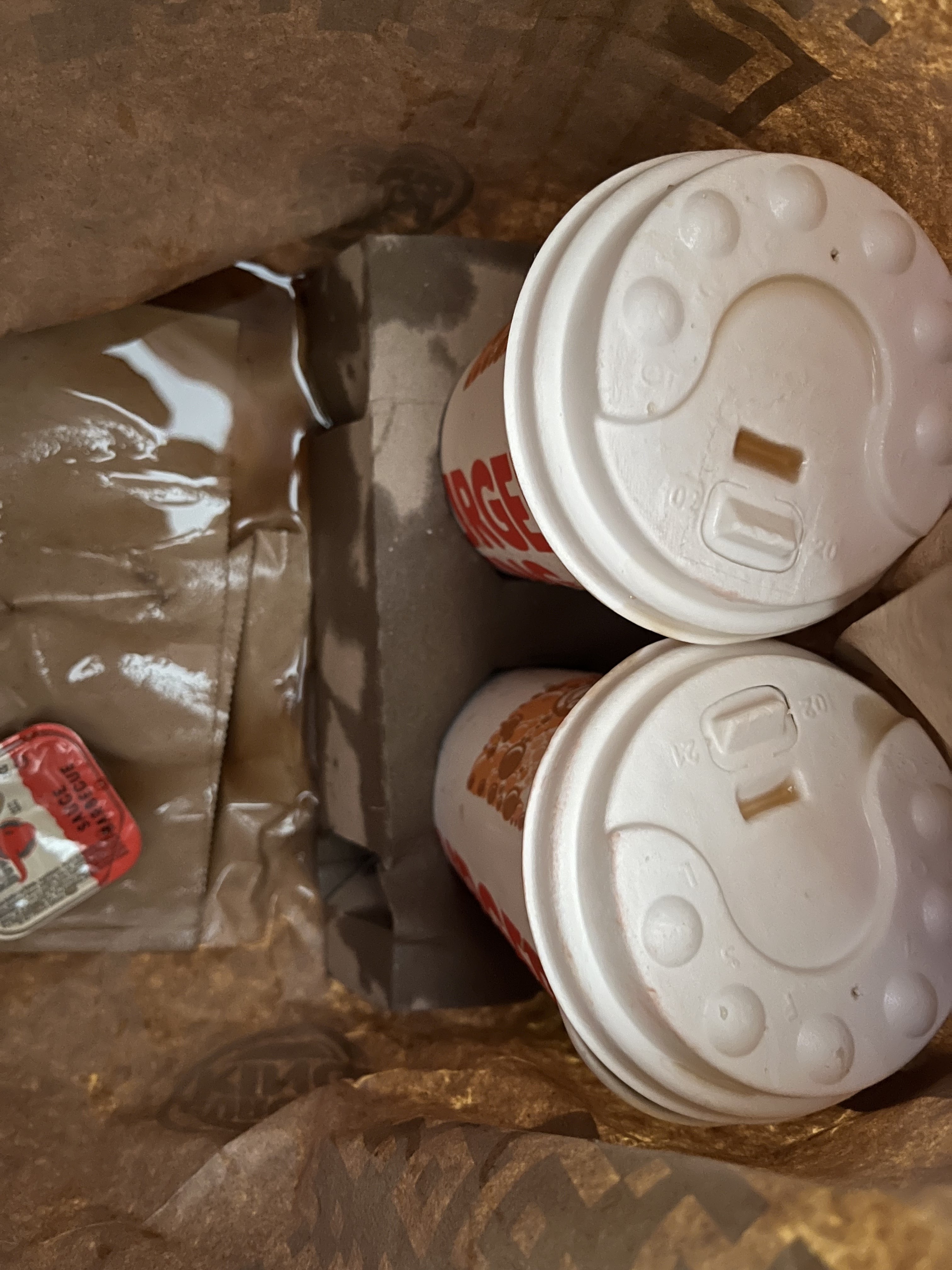 Nul pour les commandes à emporter que ce soit livraison ou emporter soi même. Les boissons se renversent le sac se déchire et tout tombe par terre. Qd le sac ne se déchire pas les sandwichs sont imbibés de boissons et c’est immangeable!!!! Plusieurs fois que ça arrive ! Les verres ne sont jamais correctement fermés et tout par à la poubelle! Quel gâchis! Respectez la nourriture et les clients!