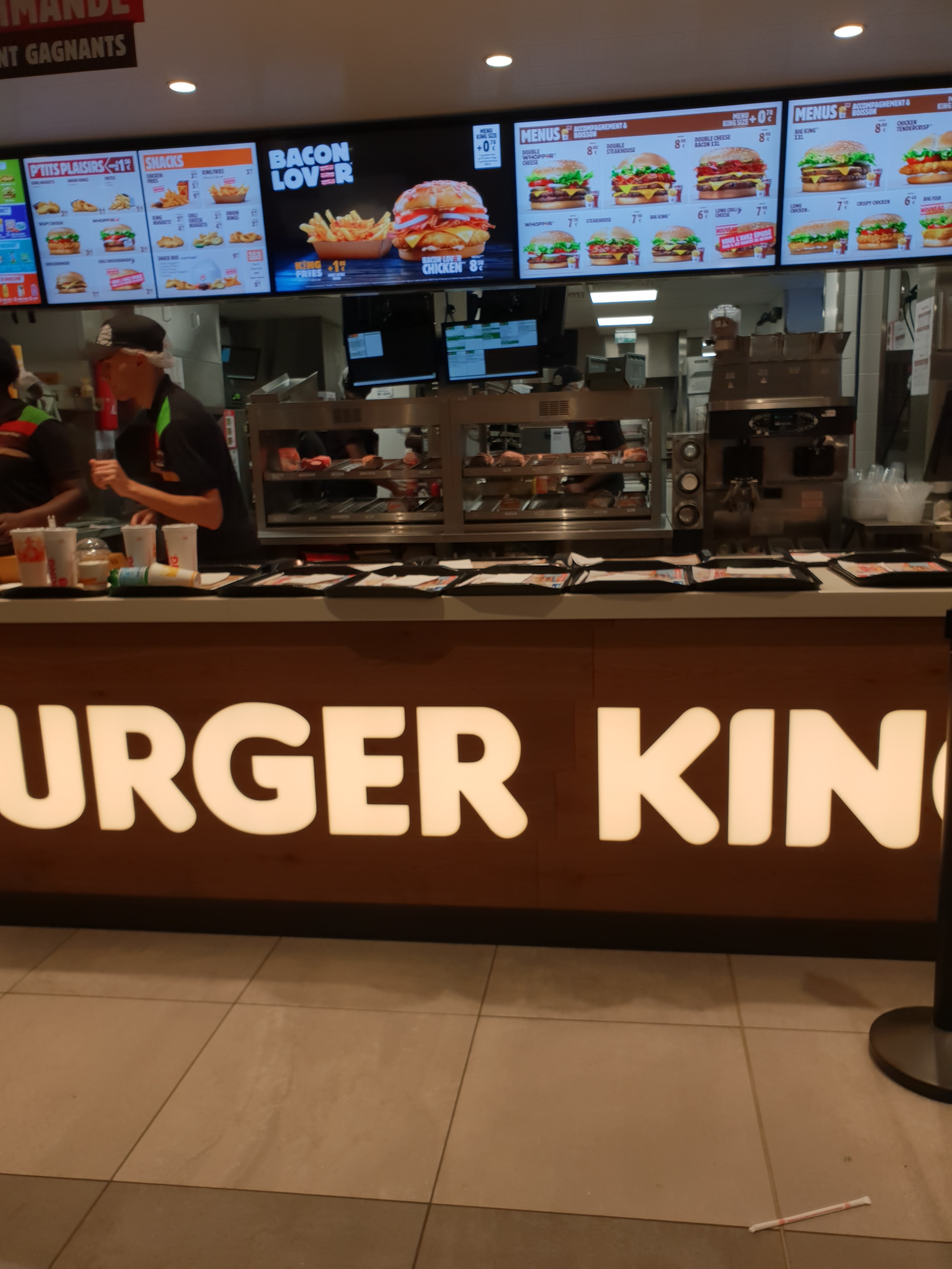 Déjà quand on commence à s'apercevoir qu'il n'y a plus de oignons rings et plus de coca cherry alors que je zappe Macdonald pour ça... on me dira qu'il n'y en a pas limité c'est normal. Puis les toilettes une honte: papier toilette posé au sol et forcément le sol rempli d'eau (normalement) avec une pancarte sol glissant alors que ça glisse pas c'est pire... biensure pas nettoyer. Le jeune homme et la jeune femme qui nous servira avec le sourire, eux et n'y seront pour rien pour nos frites froides et le fromage à peine fondu de nos hamburgers ni pour l'attente que nous avons eu alors quil ny avait pas beaucoup de monde. Et forcément quand nous allons voir pour constater que c'est froid, pas d'excuses qu'heureusement nous n'attendons pas. A part le gérant presque tous le monde s'en fout totalement donc il faudra qu'il vienne constater pour nous redonner le tous plus chaud... enfin les frites car les hamburgers on peut les manger tiède. Je reviendrai plus à ce burger King qui n'est pas un King pour moi