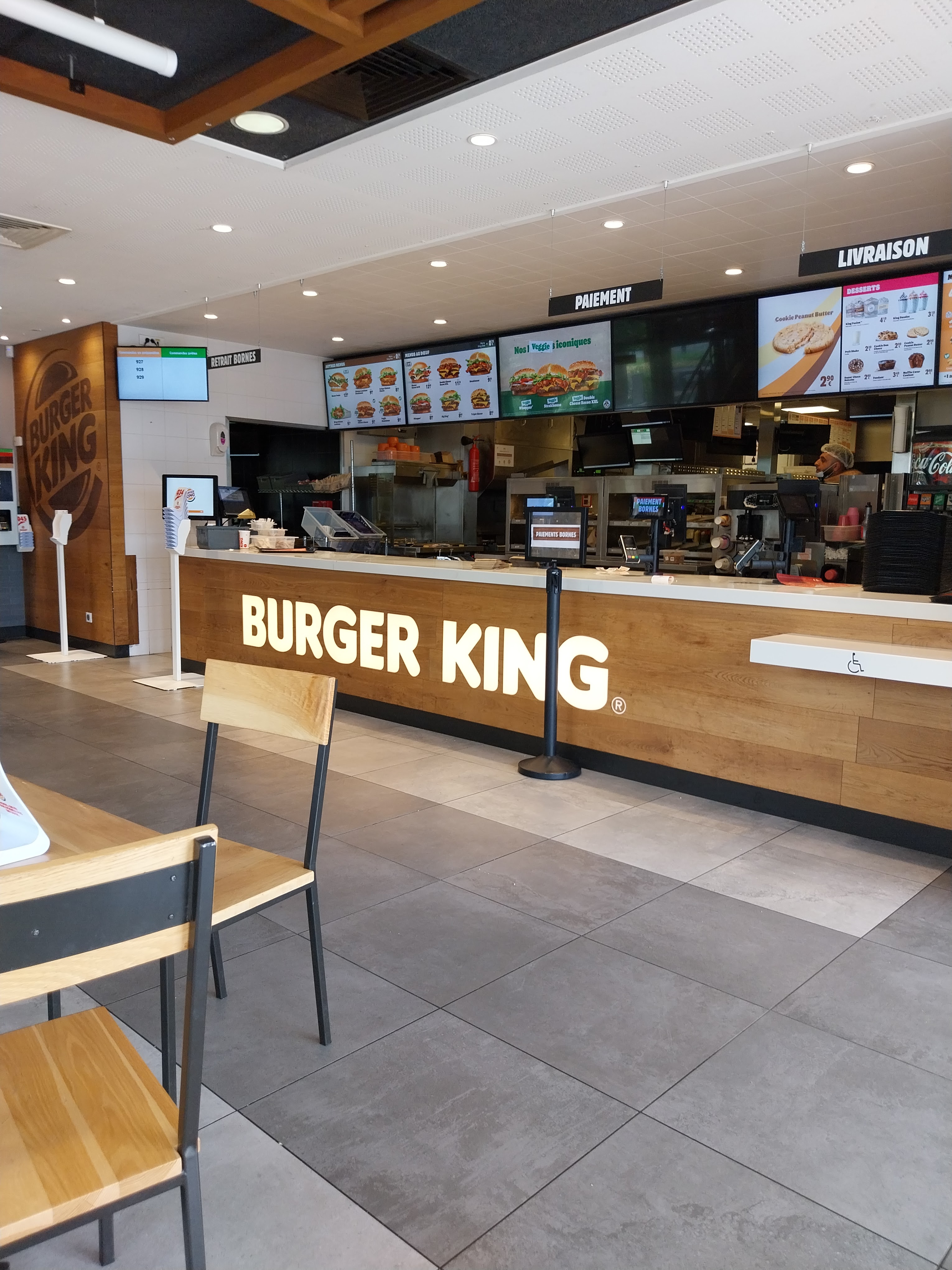 09/10/21 : Nous venons de sortir de ce Burger King et un seul mot nous vient à la bouche : un SCANDAL! Il est 15h30 quand nous arrivons, encore un peu de monde mais ça va. Nous commandons et nous rendons au comptoir pour payer. Comptoir en bazar (pas d'autre mot), du laisser aller de partout : sacs en vrac, tickets qui traînent, serviettes volantes..... Bref, il y en a partout... Nous montons à l'étage pour attendre notre commande : tables sales (des clients ont même fini par nettoyer leur table eux même avant de s'installer) et poubelles qui débordent avec des plateaux empilés sur le dessus . Une employée , qui nettoyait les tables, n'a même pas pris le temps de vider les poubelles et même pire, elle empilait elle même des plateaux! PITOYABLE ! Bref, heureusement que les burgers sont bons mais un conseil, n'allez pas dans ce Burger King là, ou prenez en drive.