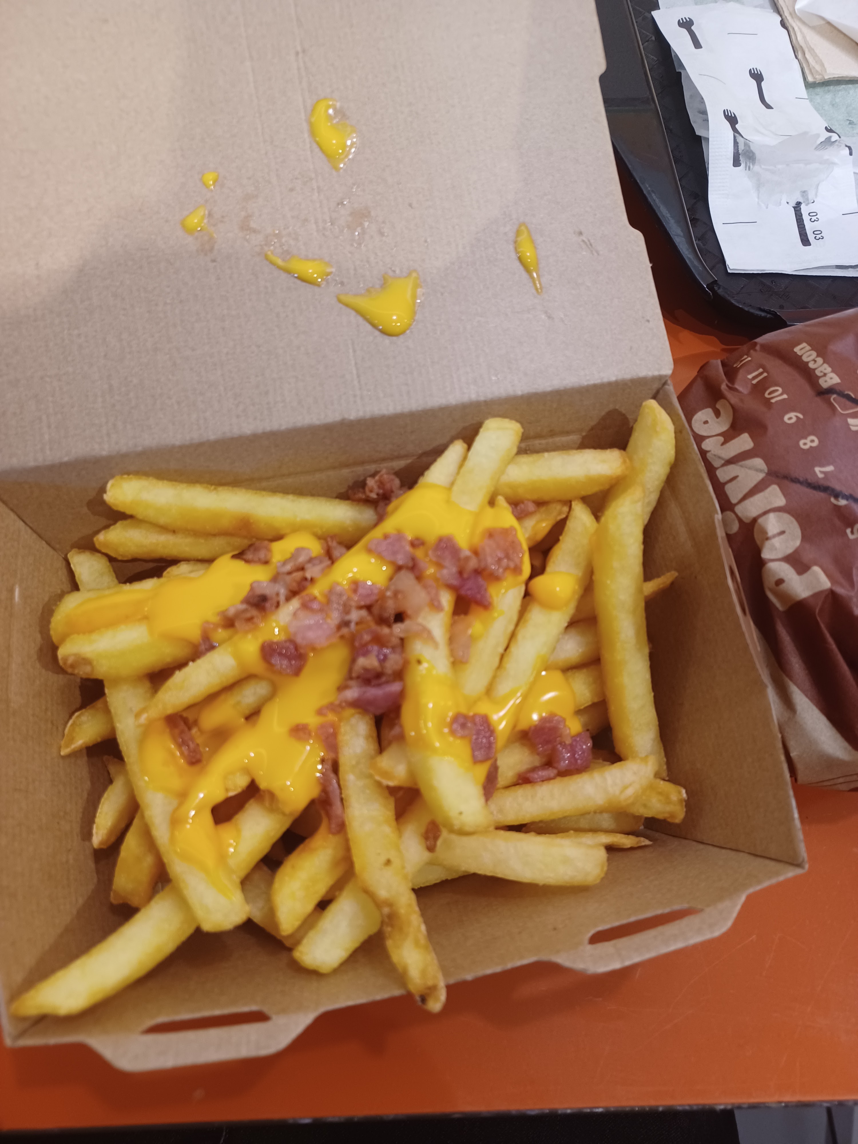 Du monde pr commander ce mardi vers 13h Seulement 4 bornes. Quelques soucis ds la commande mais bon résolu assez vite! et franchement la garniture Cheddar bacon est léger L'ambiance est bonne. Le manager est venu nous souhaiter bon app C'est tjs agréable !