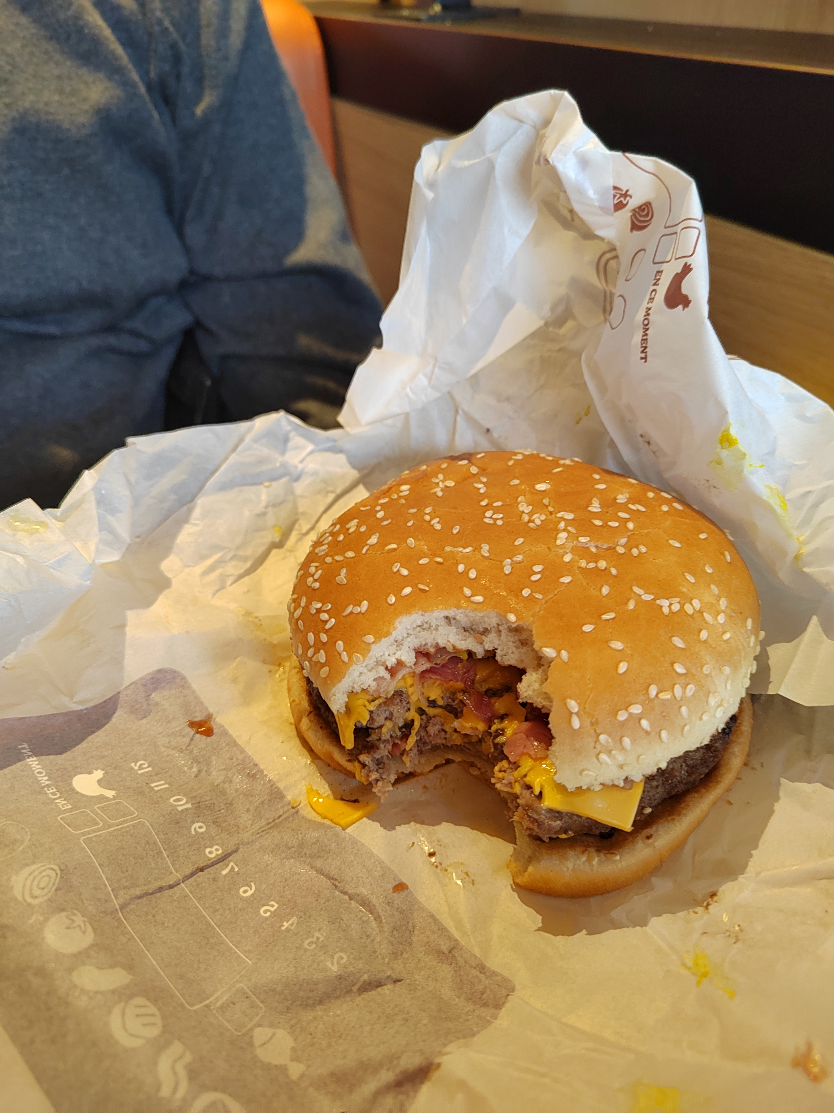 Achat d' un menu master bacon grill , à emporter , froid et sans bacon apparemment ... Très très loin de la photo 🤔