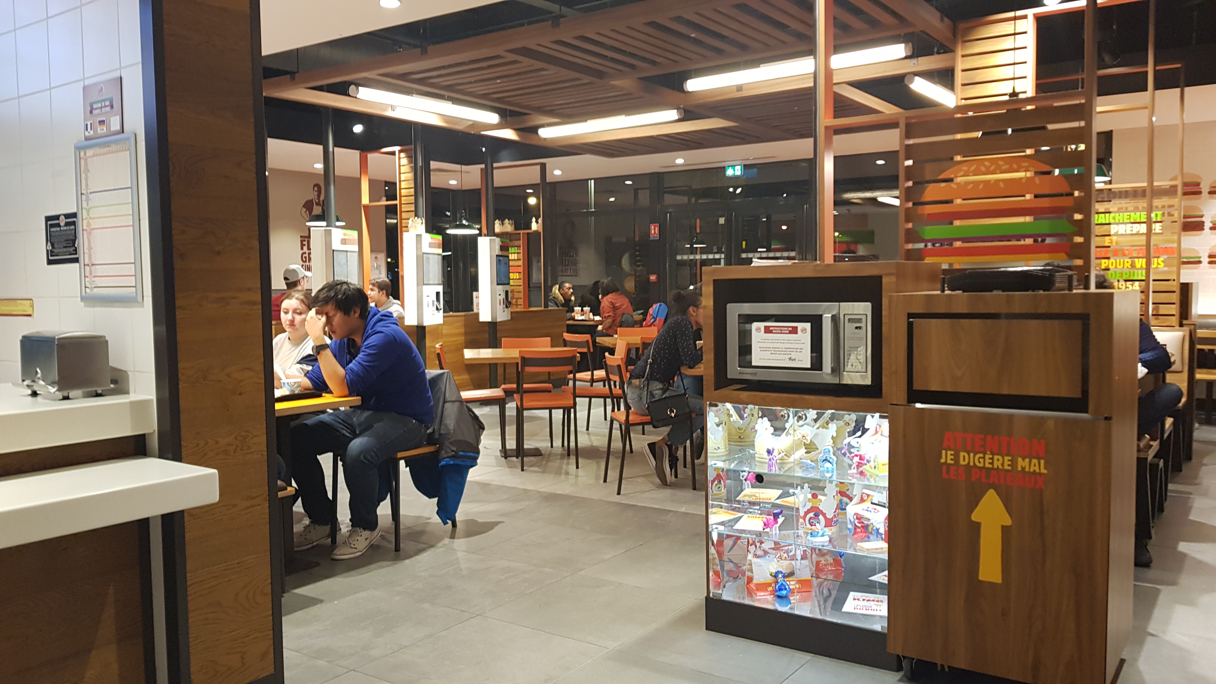 Ce n'est pas un fast-food ... Vous entrez, vous mettez devant le comptoir et l'hôtesse n'a que vous mais vous ignore Le manager arrive, il ouvre une seconde caisse et nous prend en charge. Malheureusement il est perdu sur la machine, nous indique un prix supérieur de 8€ et on attend bien plus de 6 minutes (c'est peu mais énorme pour un fast-food) pour être servis en double wooper. Il ne nous a pas laissé le choix de l'accompagnement et ne savais pas où était rangé les sauces ... C'est déplorable, il est censé être le plus qualifié, or j'ai bien dis censé
