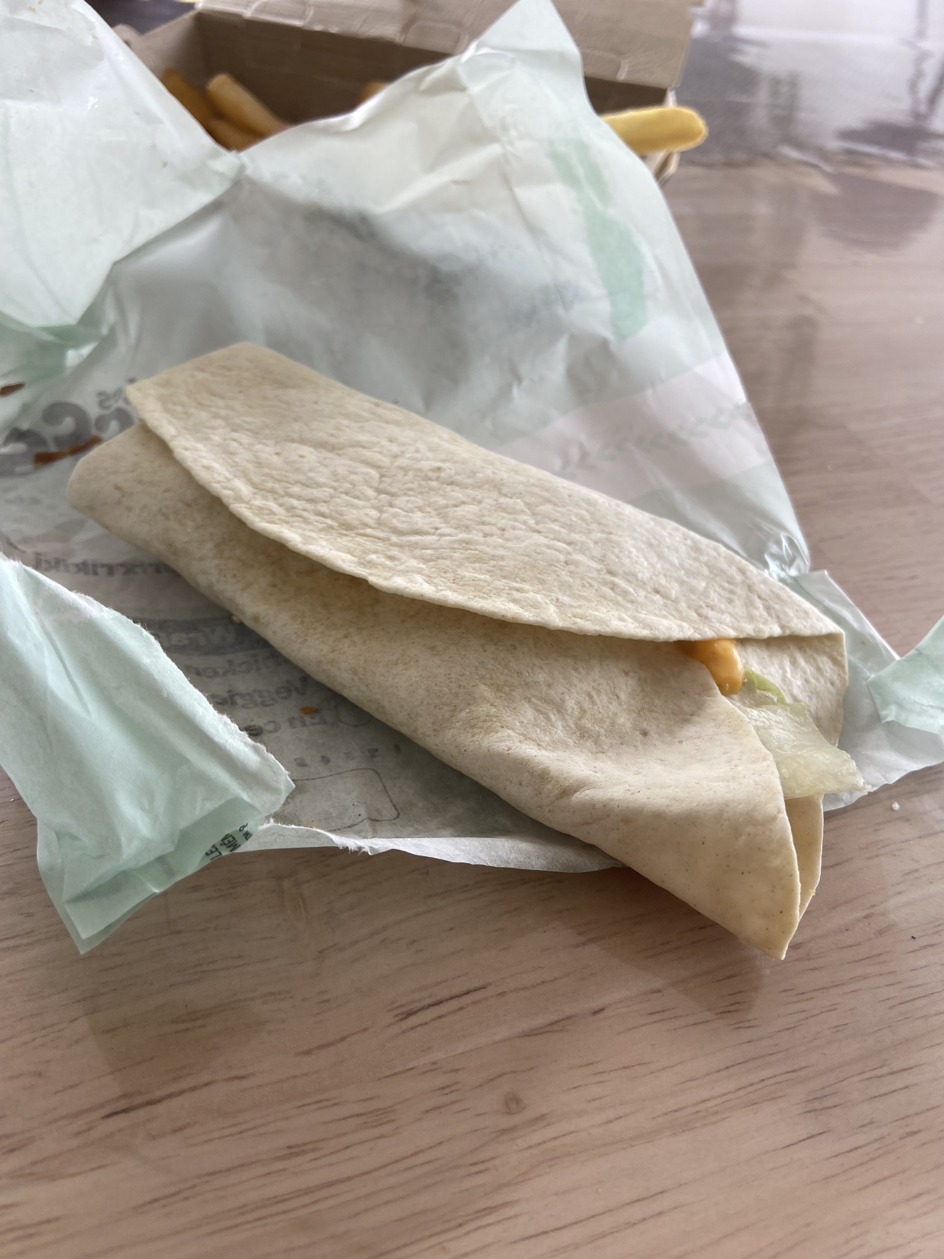 Dans le menu wrap chicken Louisiane, il manquait tout simplement...le wrap. Vu le prix du menu, se retrouver avec des frites et un fanta, génial.. Il manquait également le ketchup. Commande drive le 2 mai au soir.