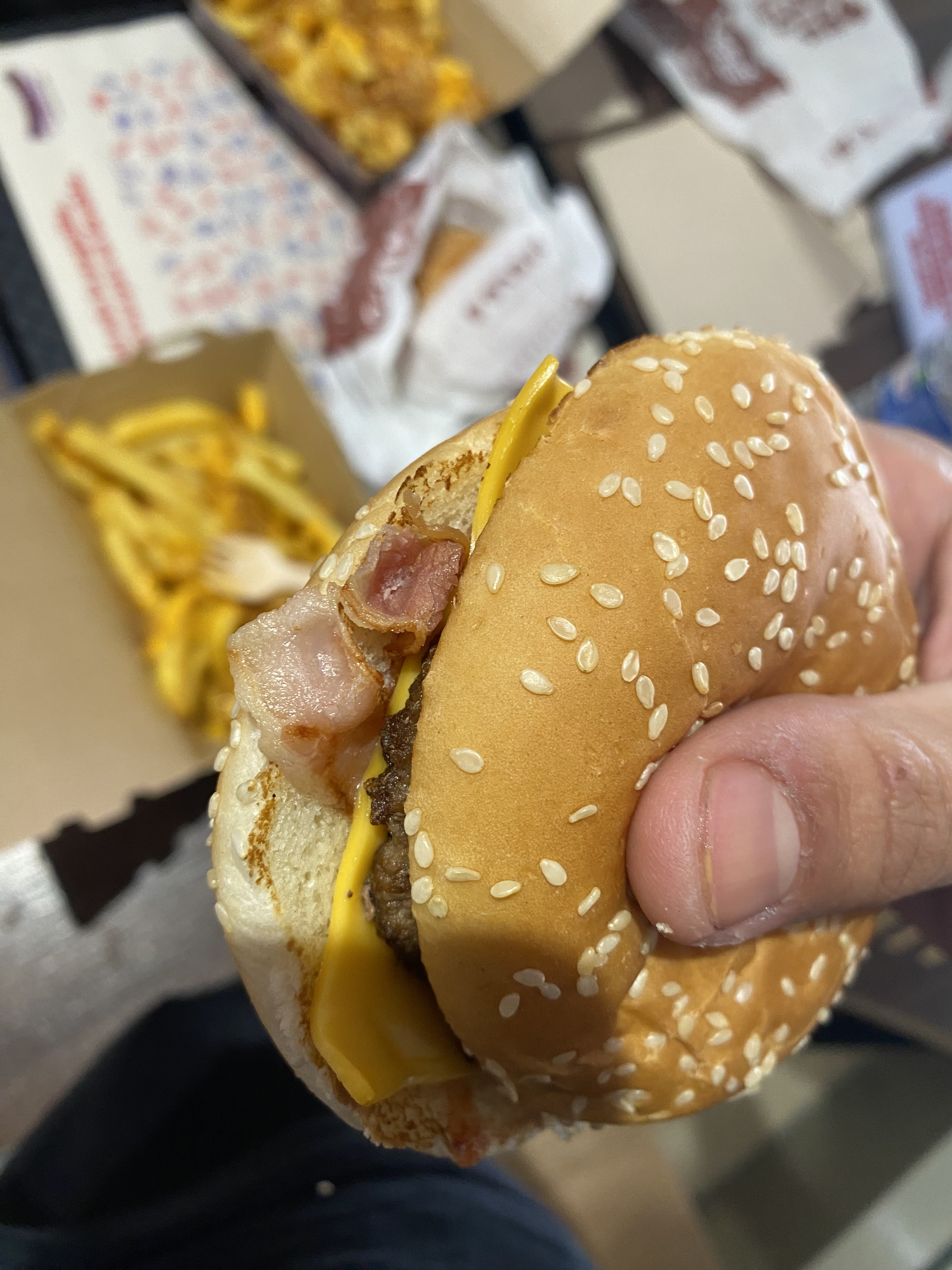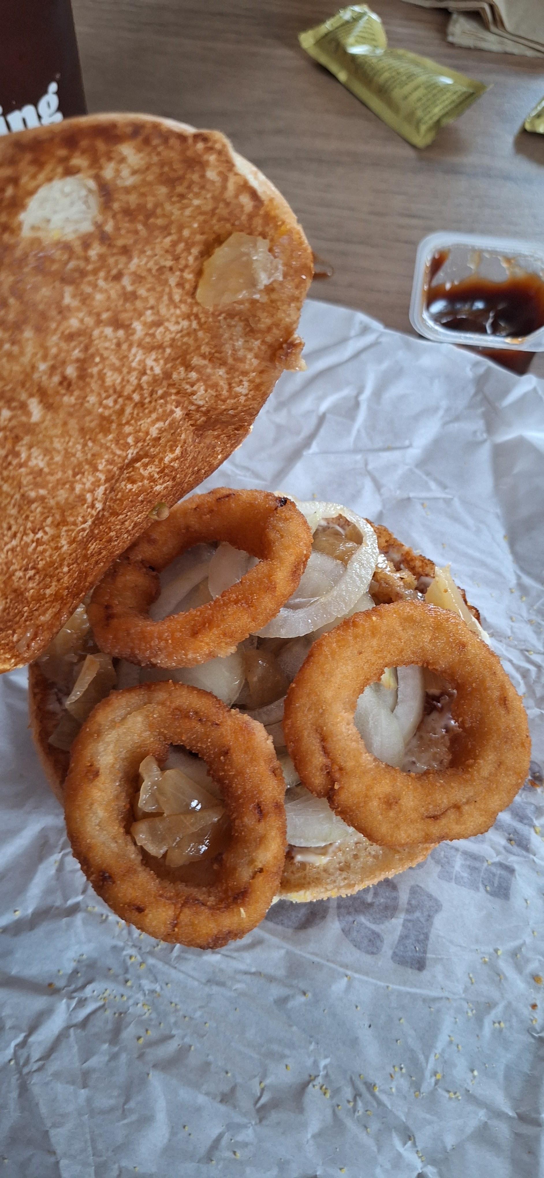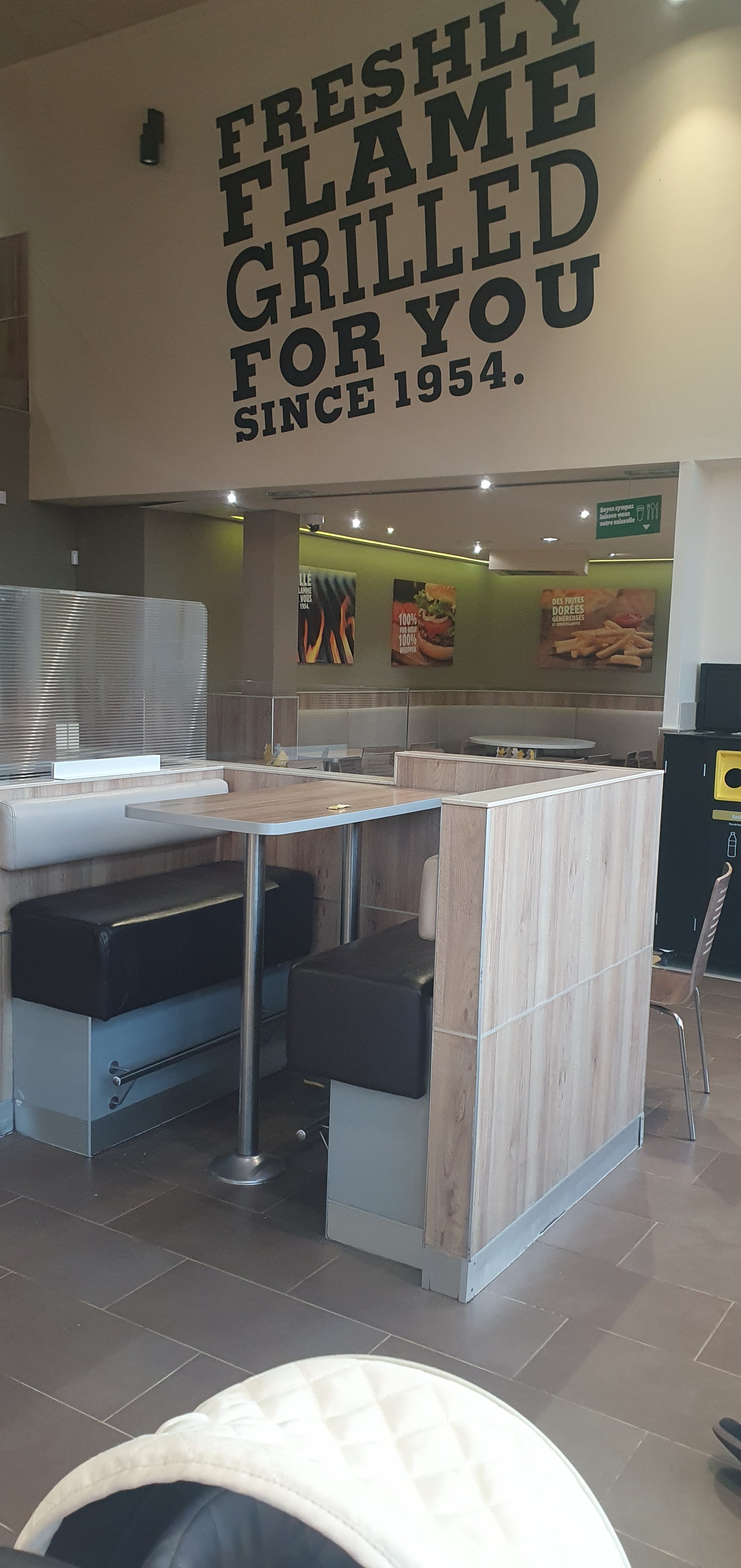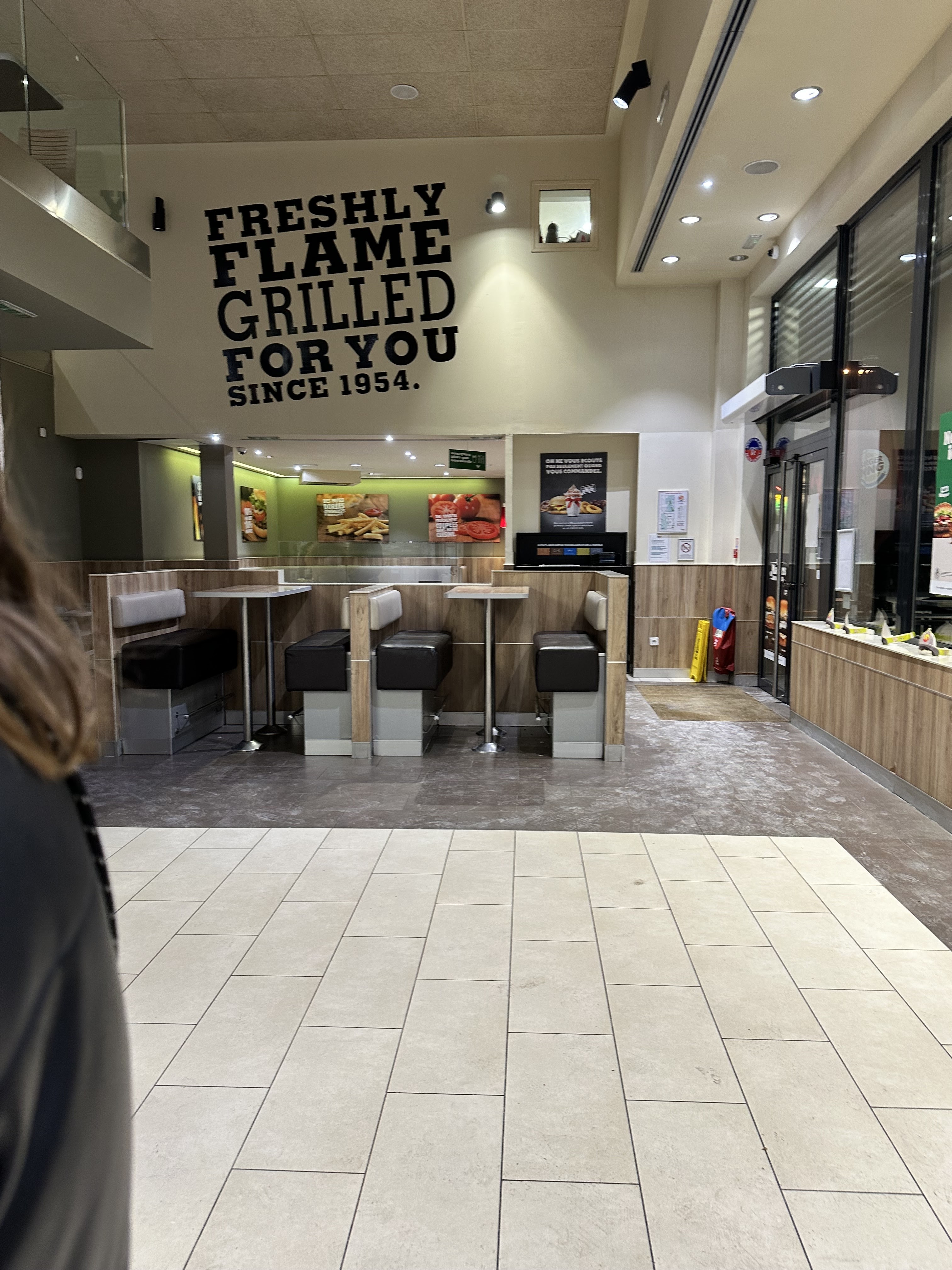 Meilleur que son concurrent les arches dorées, un vrai steack avec son goût de flamme (et pas l'arnaque de l'enseigne aux arches dorées qui ressemble a une galette bouillie sans goût où on voit a travers), oignon frit, vrai jus d'orange en canette pas l'arnaque de la fontaine immonde, cherry coke, bref bon mais l'inflation est là les tarifs ont augmenté, dommage.