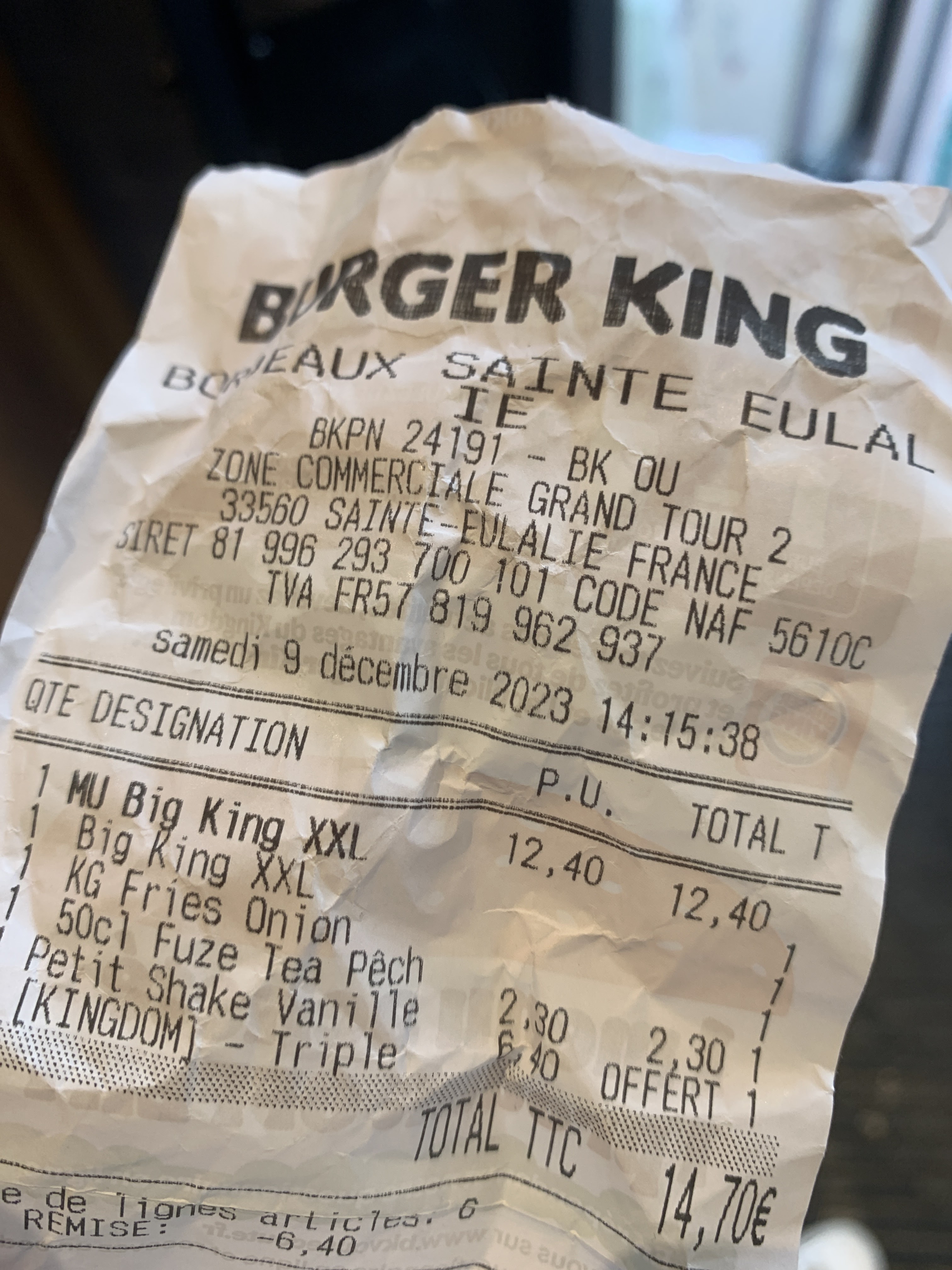 Je penses ne pas remettre les pieds au Burger King de Saint Eulalie. Une efficacité qui laisse à désirer. Fast food pas si fast que ça. Pour ma part j’ai du attendre 30 min avant de pouvoir repartir avec ma commande (photo du ticket, et heure du post à l’appuie ).