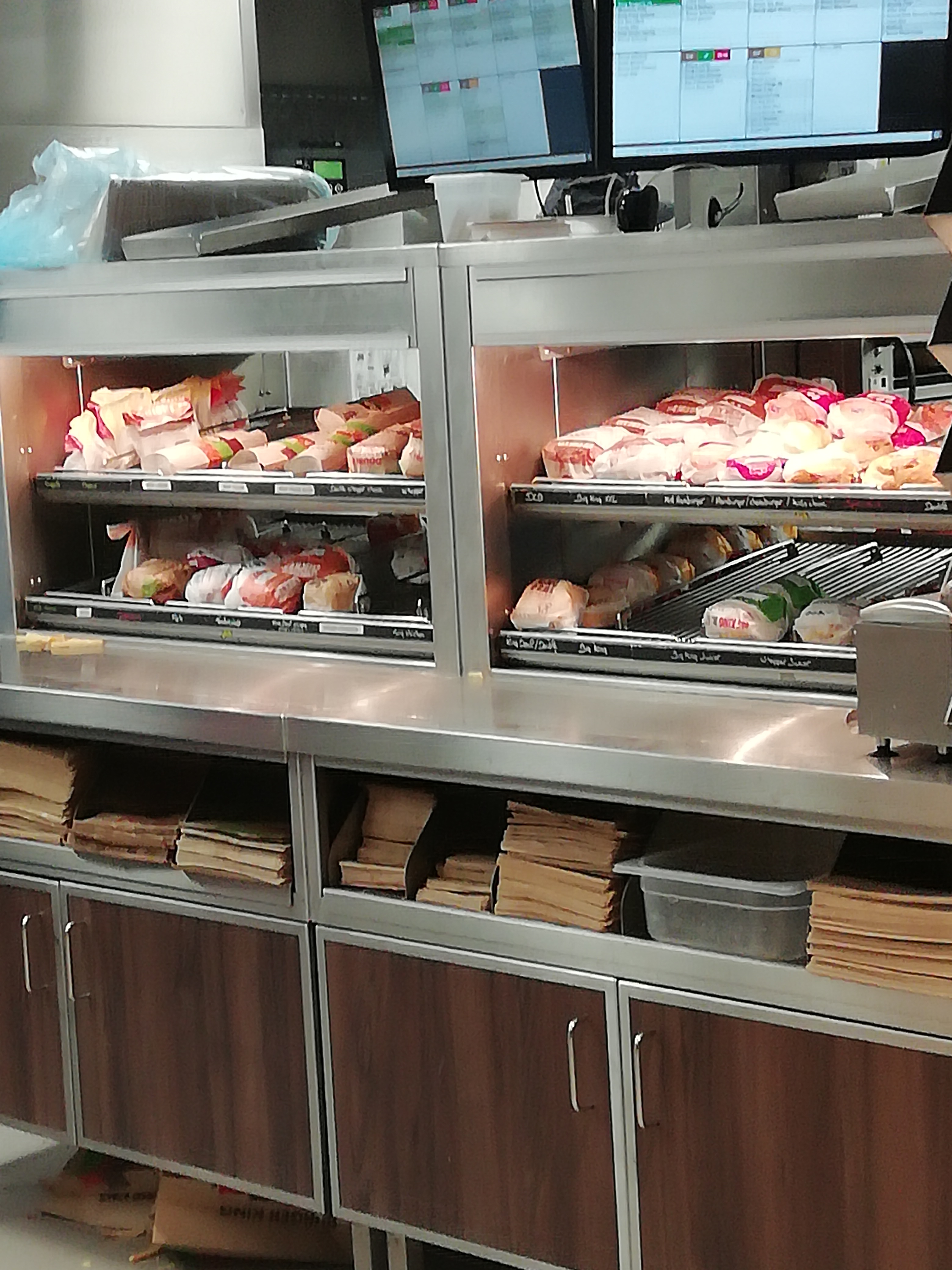 Fast food = restauration rapide!!! 35 minutes d'attente décevant. Minimum 15 commandes en attente sans compter le drive! Manager zéro pointé ! Trop peu de personnel pour un samedi. Il faudrait trouver un moyen pour que les clients soient plus réactifs à l'appel de leur numéro de commande (perte de temps). Trop erreur ou oubli dans les commandes (perte de temps). Plus de papier dans les bornes de commande (perte de temps). Pourtant l'étale de sandwichs était remplis, cf photo. La personne aux boissons, glaces compétente, très active ! Wrap sec, moyennement garni, déçu ! King fries cheese bacon est peu garni, Trop peu de sauce. Cf photo