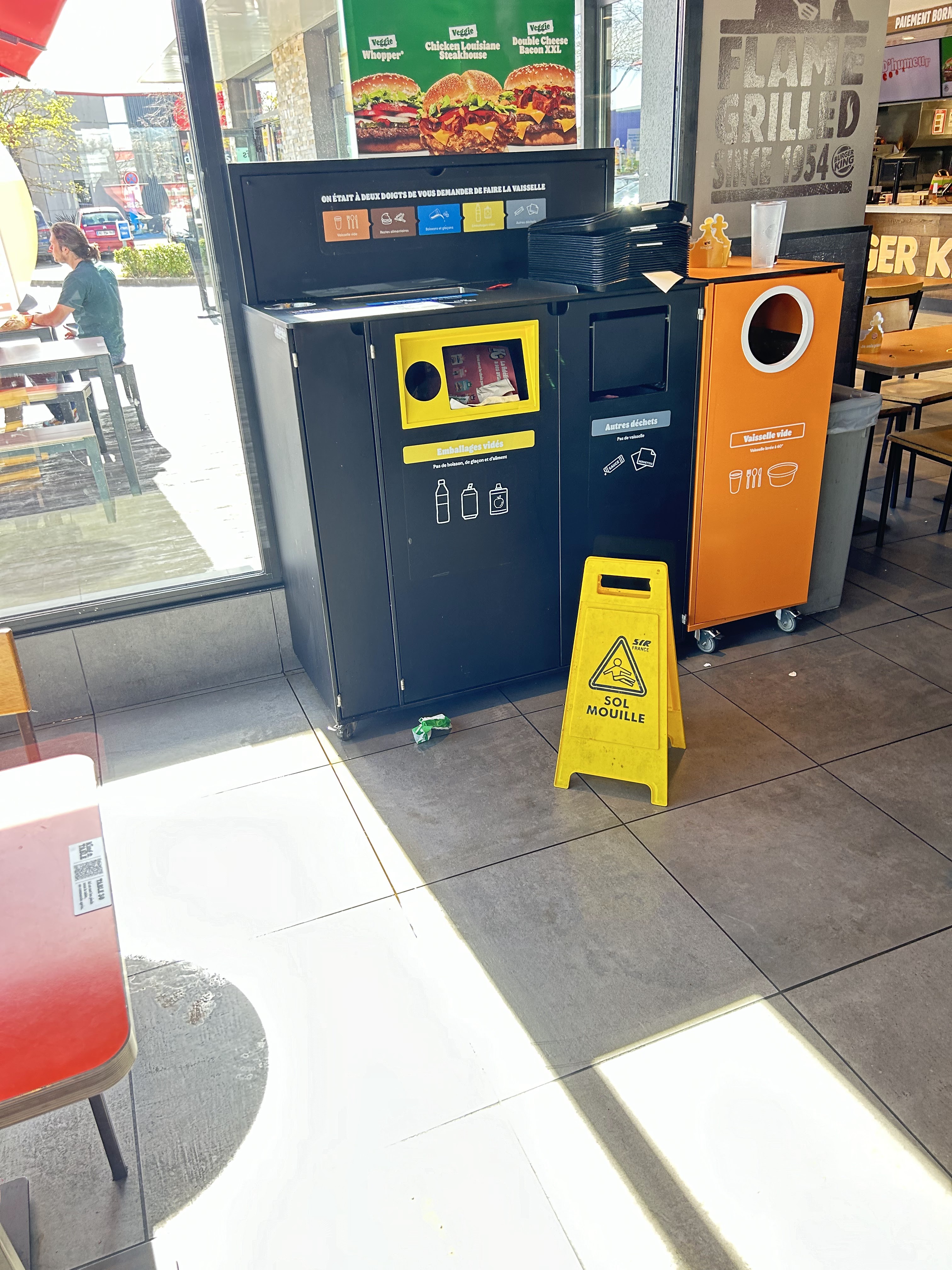 Un Burger King assez grand, très fréquenté pour un samedi à 14h30. Certainement le 1er week-end des soldes. On a du attendre 15 minutes pour être servis .. mais bon.. on a attendu. Les toilettes ont du PQ en stock et un lavabo fonctionnel mais ne pas s'attendre à une propreté..