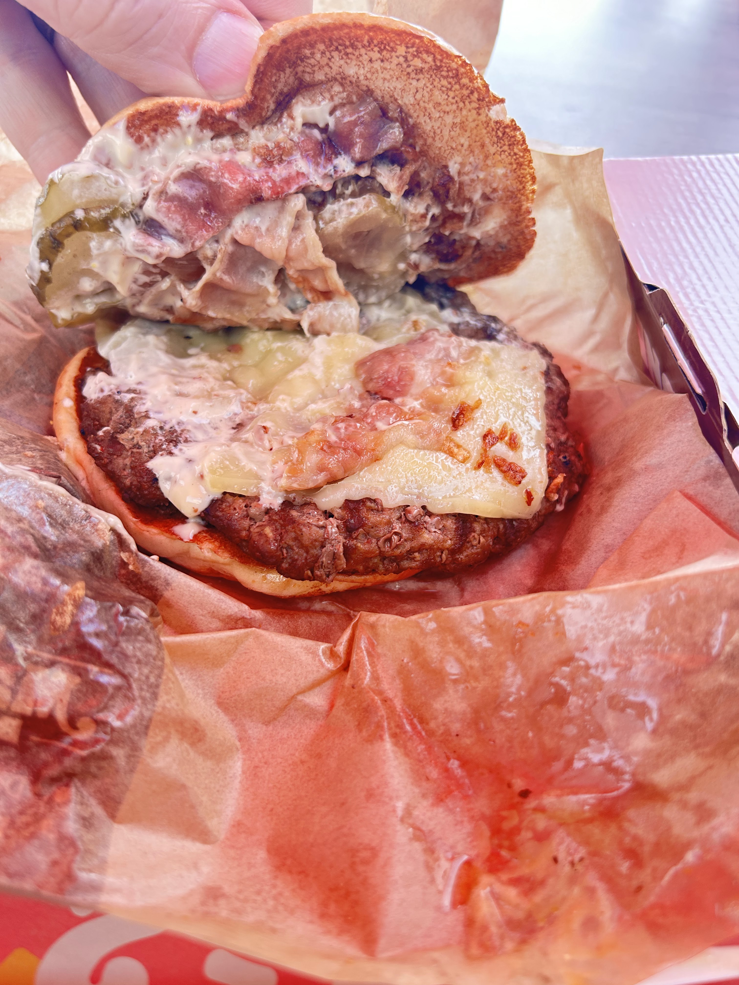 En tant qu'Américain, j'avais honte. Je n'ai jamais vu un BK avec un service aussi sale et mauvais. J'espère que quelqu'un de l'administration BK lira ces commentaires et proposera une solution. S'il vous plaît regardez mon burger au bacon !!! Regardez leur sale endroit. Inacceptable.