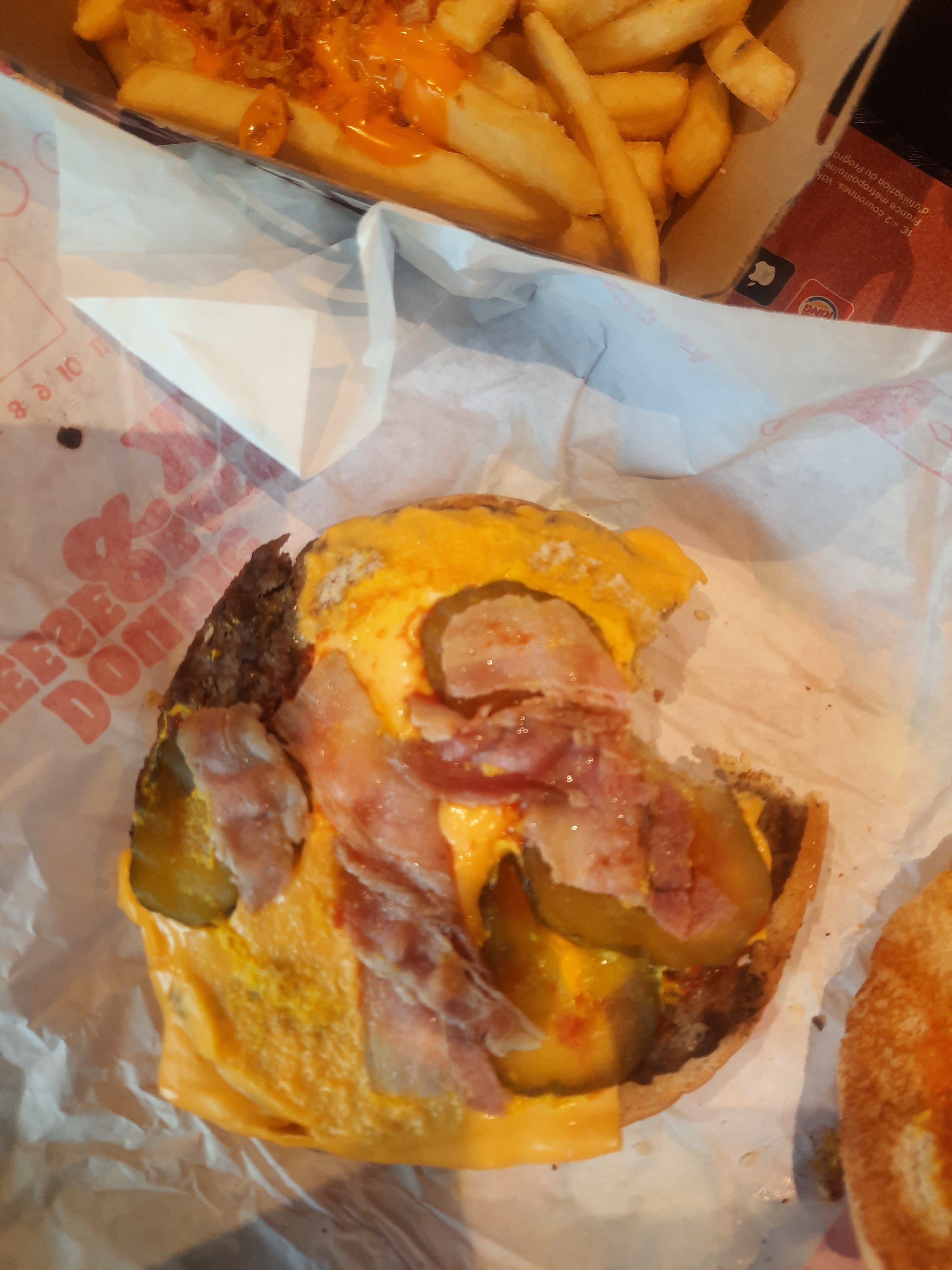 Déçu de ce burger king ON PAYE LE MEME PRIX POUR UNE PORTION PLUS REDUITES, CEST INACCEPTABLE, MA BARQUETTE DE KING FRITE ET DE MOITIÉ COMPARÉ A AVENT ET LE BAGON CEST A PEINE SI IL EN A