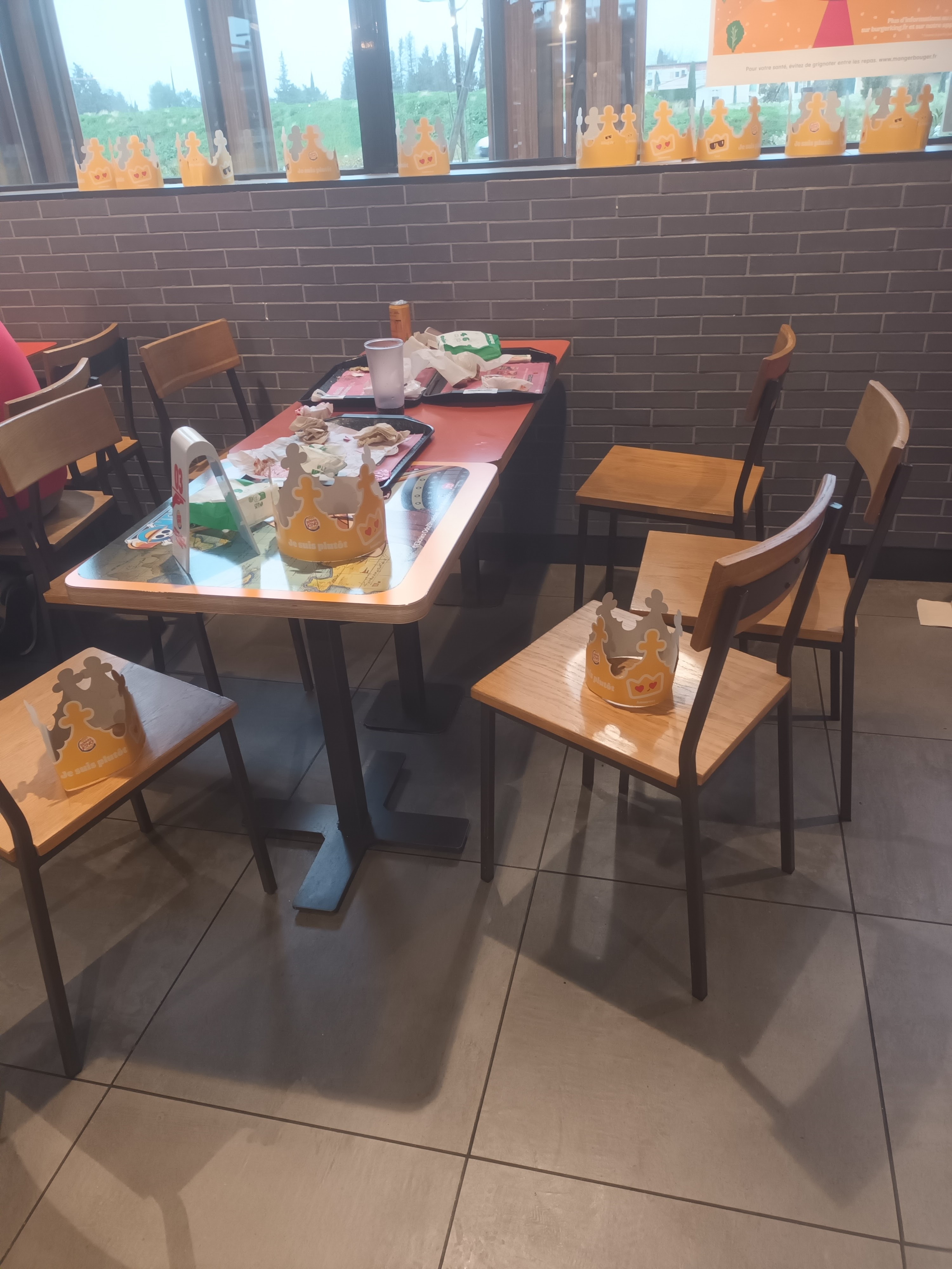 Ce Burger King est très sale Nous sommes allés y manger le 3/12/23. Aucunes tables n’étaient propres… je ne vous parle pas du sol… et encore pire des toilettes… Première et dernière fois que j’y mange… J’espère que je ne vais pas tomber malade… Vraiment déçue - deconseillé…
