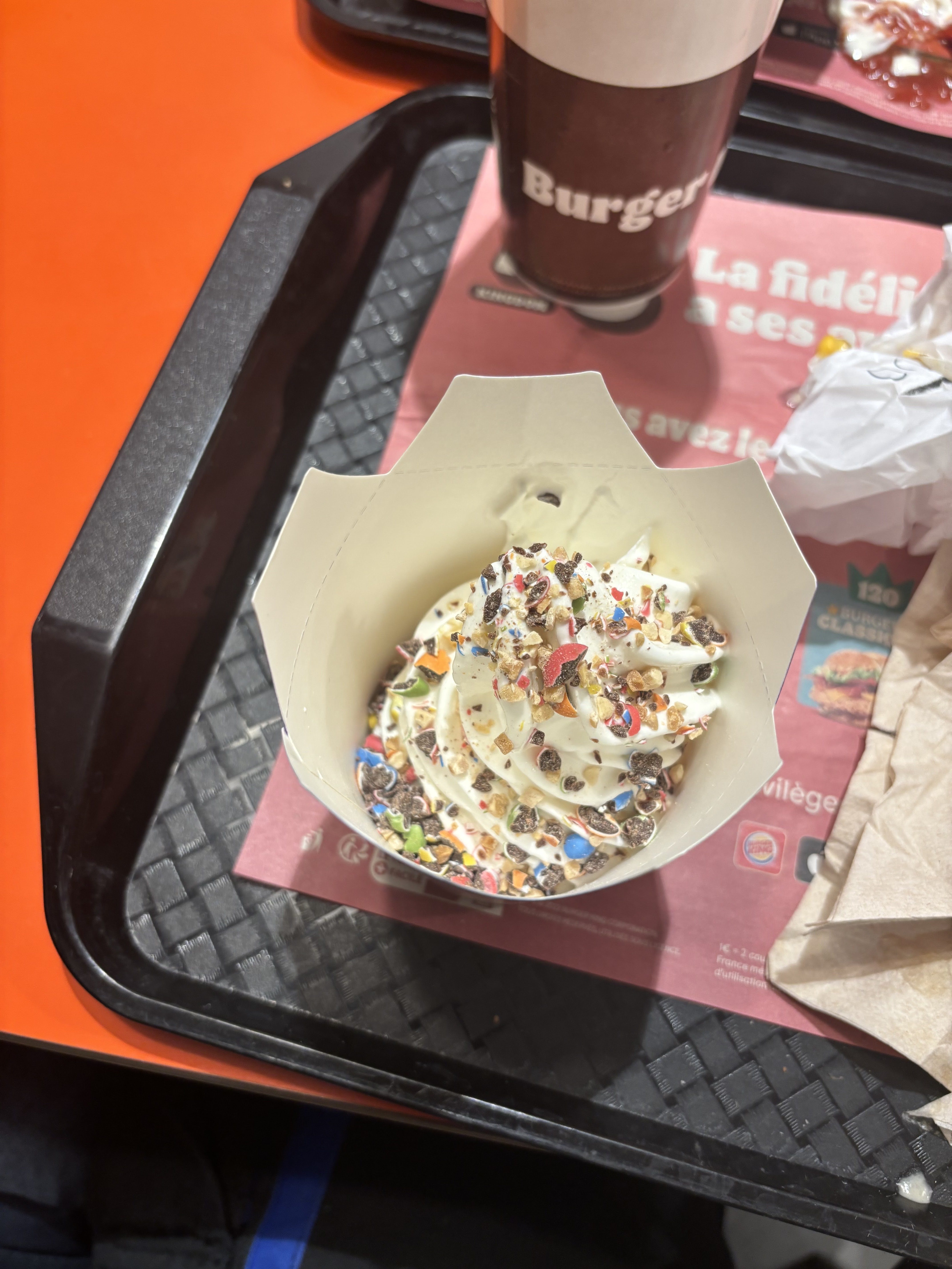 Dans l’ensemble les sandwich sont bons, mais les glaces ? La quantité équivaut à une glace à l’italienne et les m&m’s dans le King fusion font même pas un m&m’s entier (j’abuse légèrement). Vraiment déplorable par rapport à à l’argent qu’on dépense dedans. C’est quand même plus de 4€ alors que c’est la quantité d’un mini King fusion (et même dedans je suis sûre qu’il y a plus de m&m’s!) C’est vraiment honteux de nous faire payer un tel prix🤦🏻♀️ Et pour le coup sur les photos c’est juste une impression qu’il y en a pleins par rapport à l’angle ou elles ont été prises, mais on a été choqués de voir la quantité en vrai.