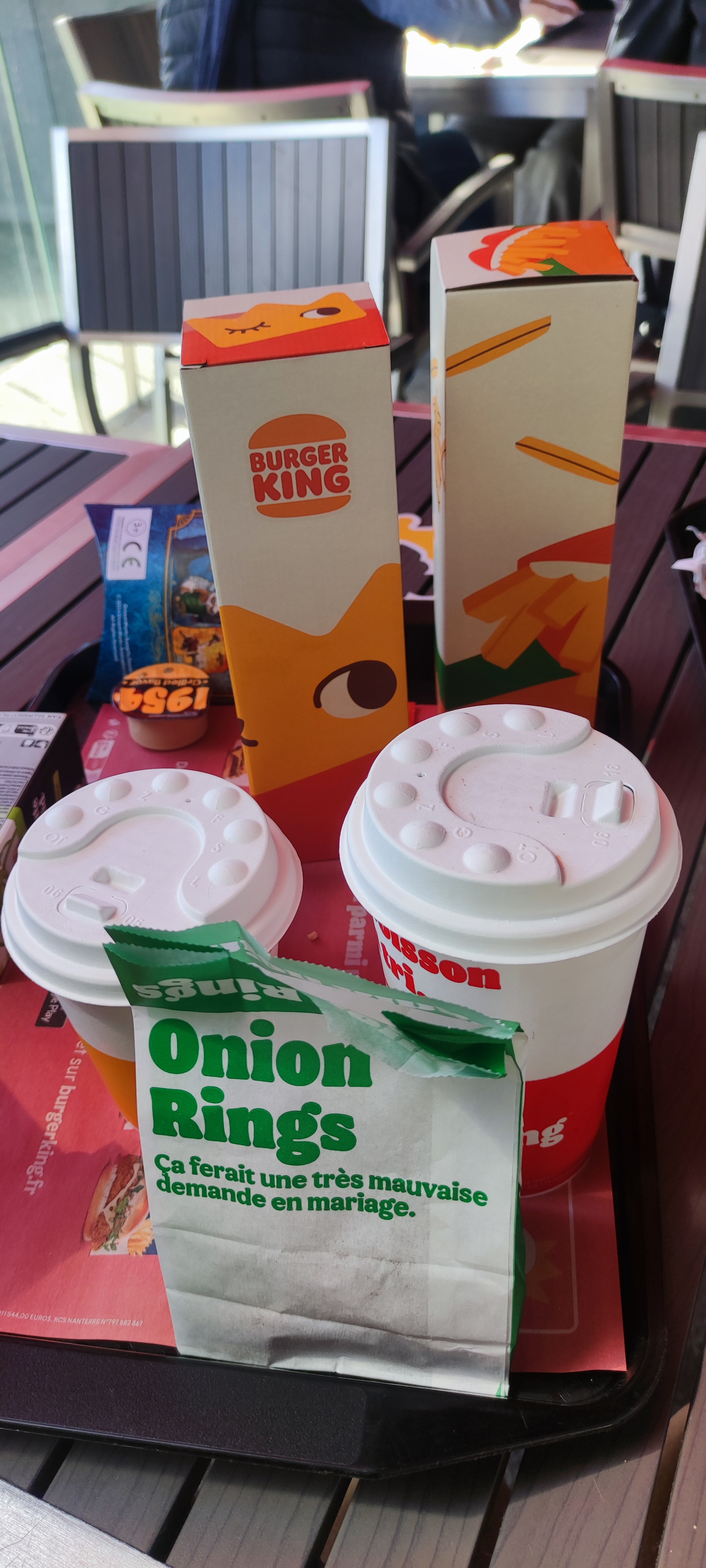 Les frites CROUSTILLANTES comme d'hab chez burger king et on aime ça. Les burgers très bons, classique, les oignons rings avec la sauce, masterclass. Que dire de plus...