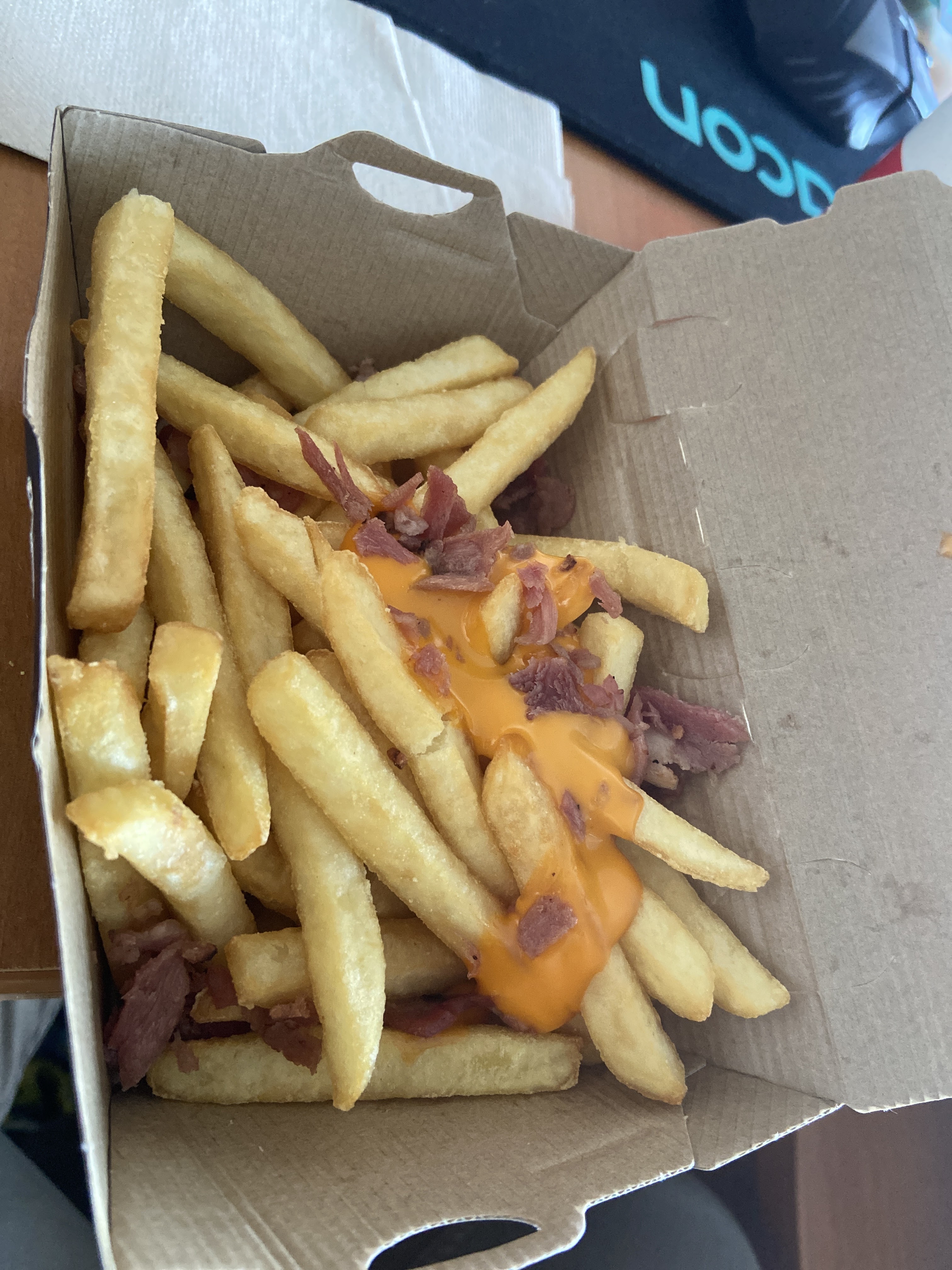 Voici les frites, cheddar, bacon... Les frites sont froides et à peine cuites. Le minuscule truc au dessus, c'est le cheddar et le bacon... J'ai mis 2 sur 5 mais je suis prêts à mettre 5 si la qualité est au rendez vous la prochaine fois. Et 1 si ça reste comme ça.