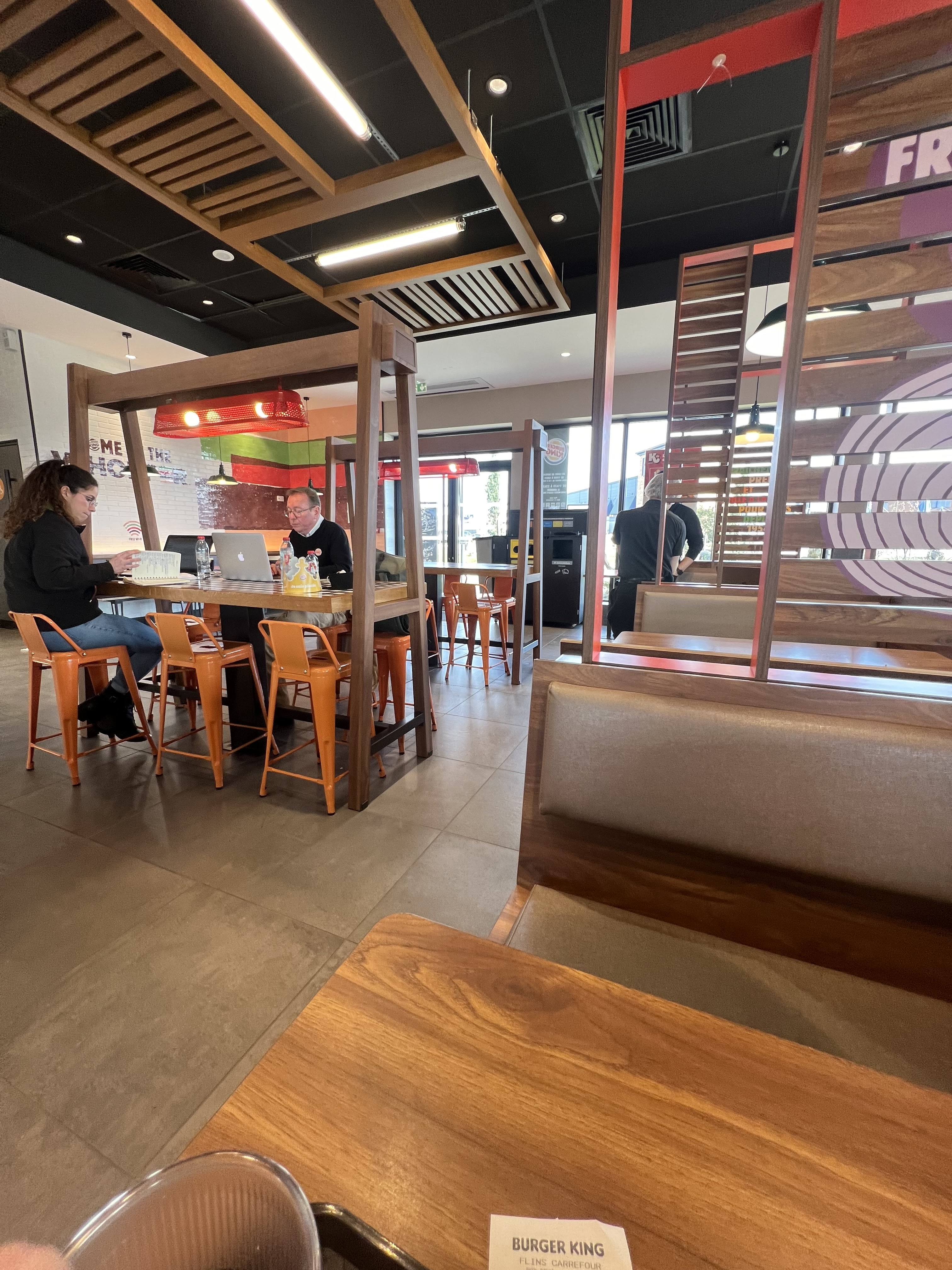 Ce Burger King est propre, calme, grande salle de restauration, terrasse, aire de jeux. Service rapide et personnel aimable. Des prise 220 et usb sont disponibles sur les tables.