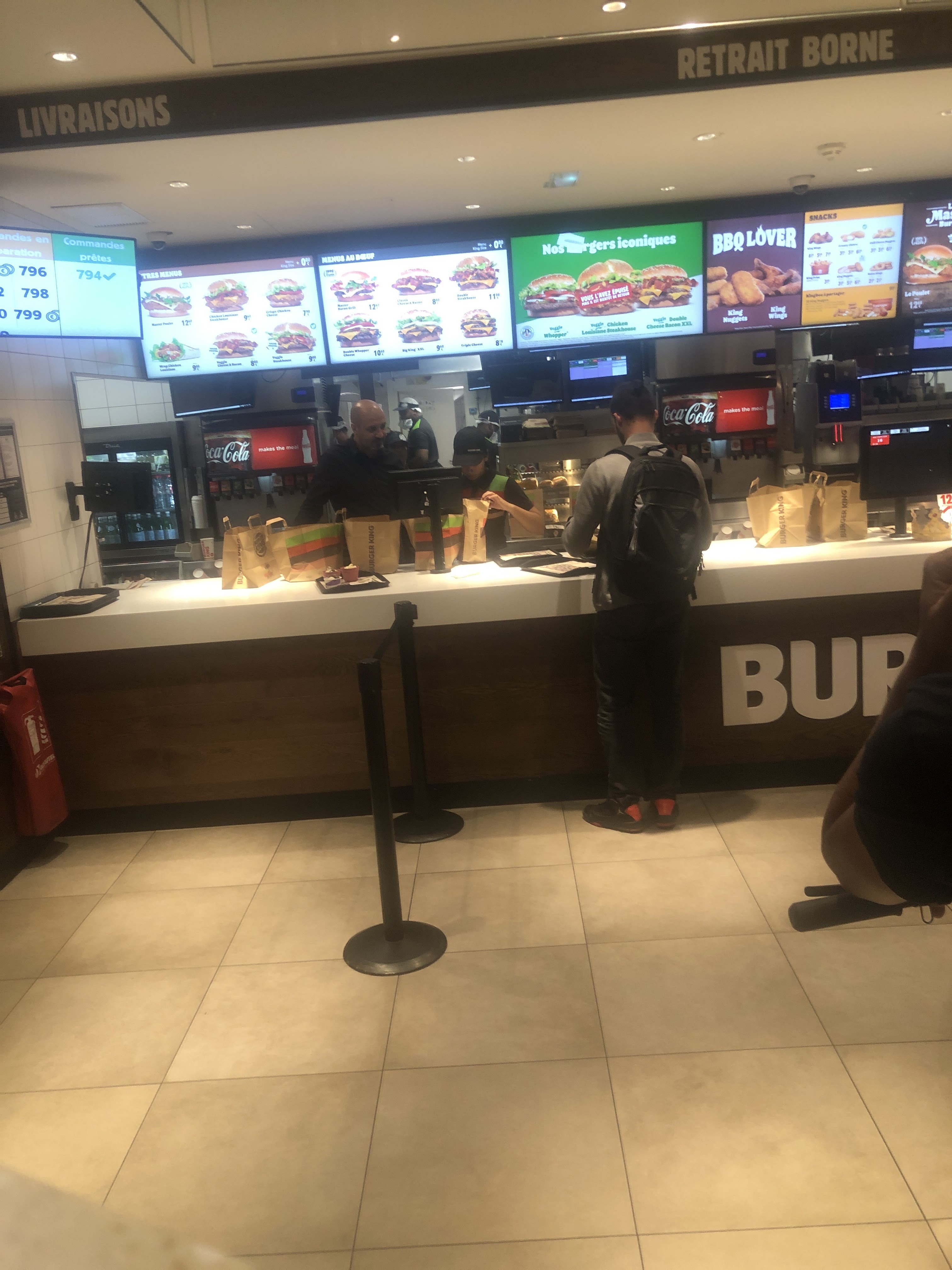 Venu ici pour me restaurer avec quelques collègues, nous nous sommes régalés. Je vais donc énoncer les points positifs et négatifs. Les points positifs: Visuel des burgers comme dans les publicités Montage des burgers: parfaits Pour la saveur des burgers, fidèle aux attentes, excellent Service rapide, serveur aimable et respectueux Locaux qui sont, dans l'ensemble, propre. Petits points à améliorer: A mon goût le chicken Louisiane manquait un peu de sauce épicé Une commande servit sans les sauces à part+ petit oublie d'une cuillère Les onions rings étaient mal cuits(manque de croustillant) Le tactile des bornes laisse à désirer. Point bonus: Le serveur a débarrassé mon plateau, innatendu mais très sympathique de sa part. Pour finir, nous sommes arrivés le ventre vide et répartis le ventre plein, tout ce qu'on attend d'un fast food.
