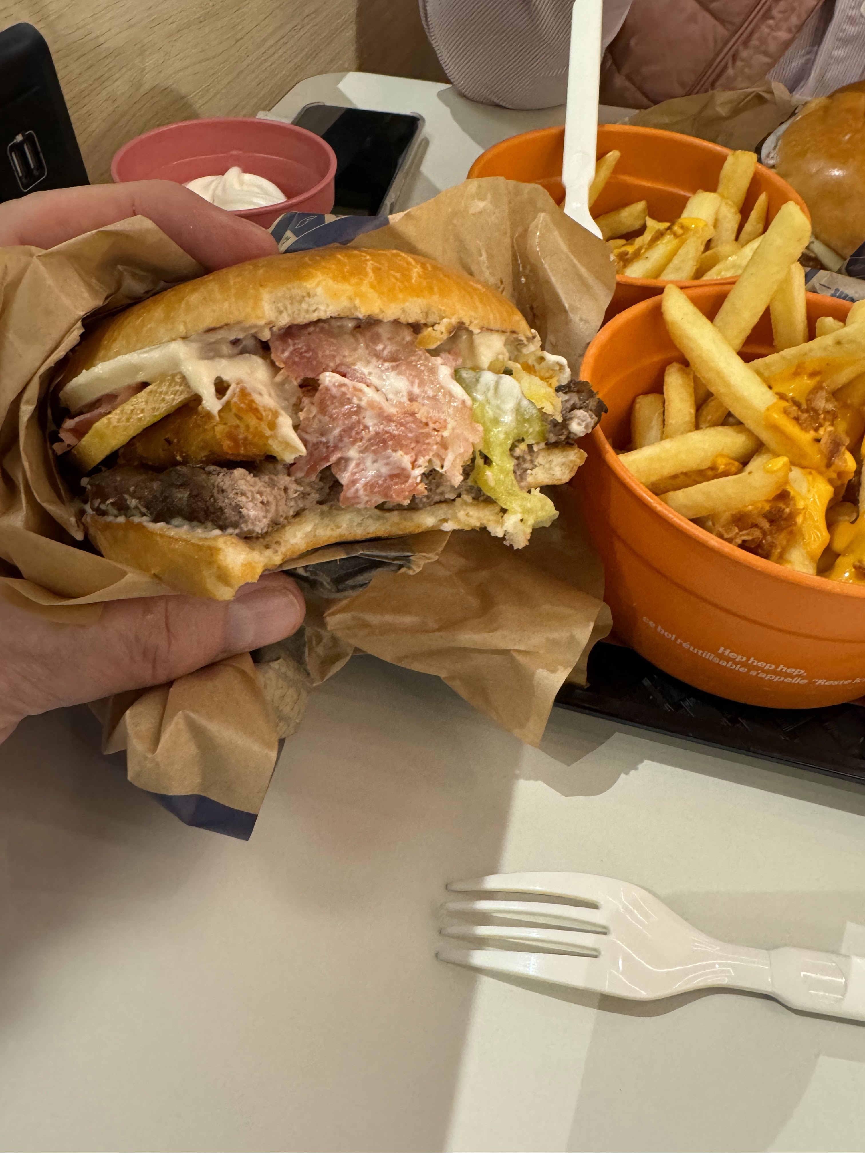 Comme toujours dans ce genre de restaurant il y a beaucoup de bruit sinon les burgers ressemblent aux photos de présentation ce qui est rare. Il y a plein de bornes de commandes, un point retrait, comptoir classique, service à table et une terrasse avec jolie vue le tout pour un prix raisonnable.