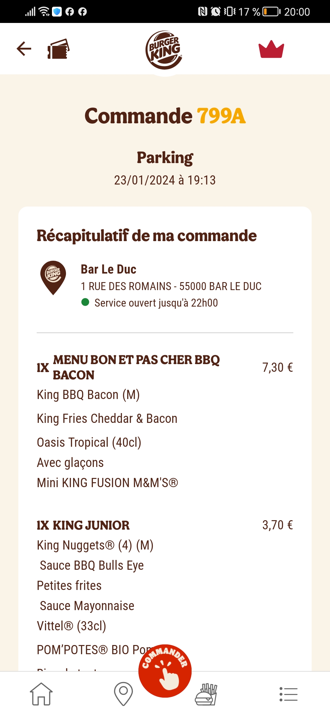 3 fois pour moi chez burger King de bar le duc et franchement faut vraiment faire quelque chose, 1 fois reparti avec des manques sur la commande, 2 ème on reverse mon coca avant de le mettre dans le sac sur les baskets et la 3eme fois, on ce dit aller on fait une commande internet, et la pareil, il y a des places réservé pour cela, la jeunes sort et ne voit pas qu'on est la, obligé de descendre pour recupere la commande, tout est la sauf une fourchette pour les frites cheddar après on peu encore manger avec les doigts, mais la glace sans la cuillère ni même une serviette non la c'est abusé, il y a vraiment des choses à revoir vraiment. Même si j'aime assez vos 🍔 je ne sais vraiment pas si je revendrais en tout cas pas à bar le duc