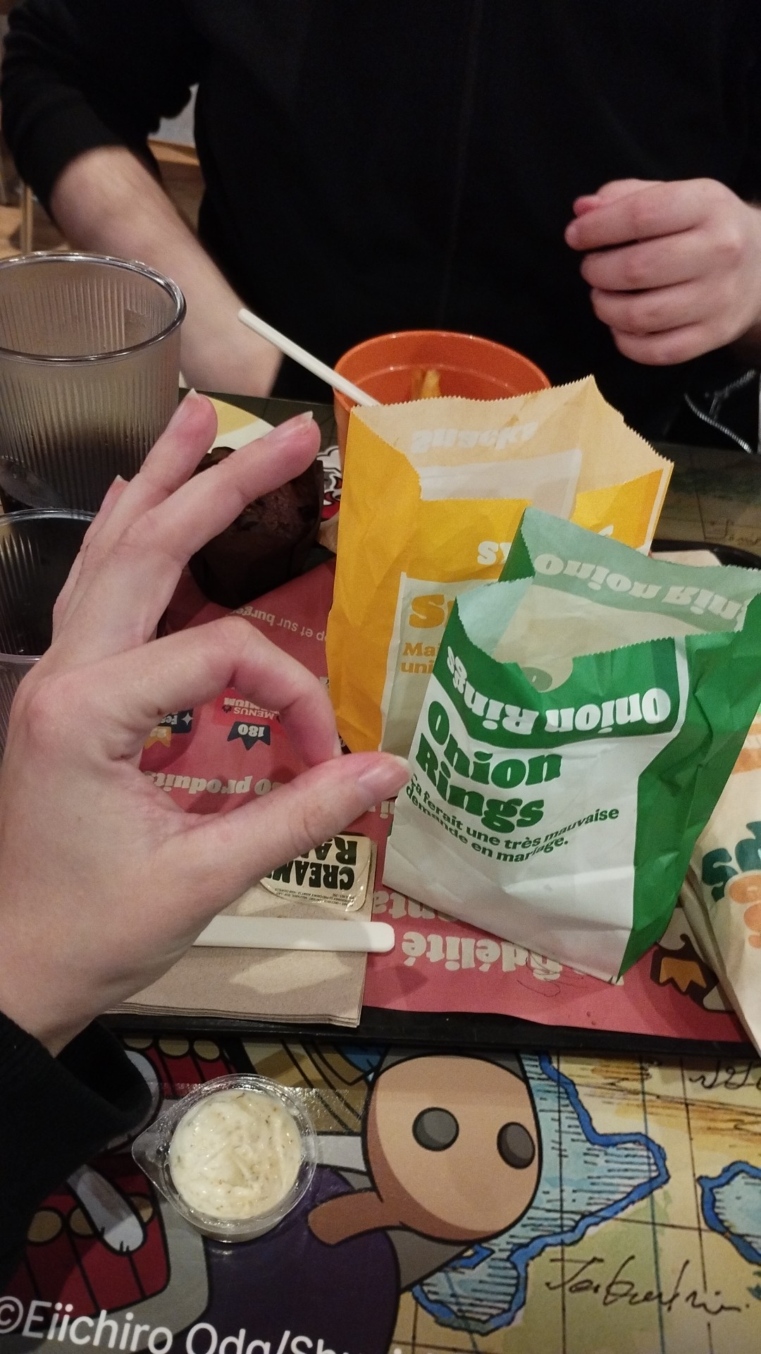 Organisation de cette équipe à revoir,on va encore parler du coup de bourre,mais dépassé de chez dépassé sans oublier les oublies dans les commandes, ainsi que les attentes . À les affiches des burgers sont belles mais nous client aimerions retrouver la même chose dans nos commandes, et la quantité de frites cheddar oignons en XL à 2,90€ en plus alors que je me retrouver avec une petite quantité (15 frites 🤔),ça, comme les glaces comme le petit Nutella ou la présentation et l'attente reste à désirer ( la cacahuète se met après le Nutella et non pas entre la glace et le Nutella) mais aussi et surtout le Nutella que sur un côté dans le pot et plein en extérieur et sur la partie où vous tenez votre pot de glace.Ce fût, malgré tout bon , mais déception sur la présentation des produits pour une commande à 55€.