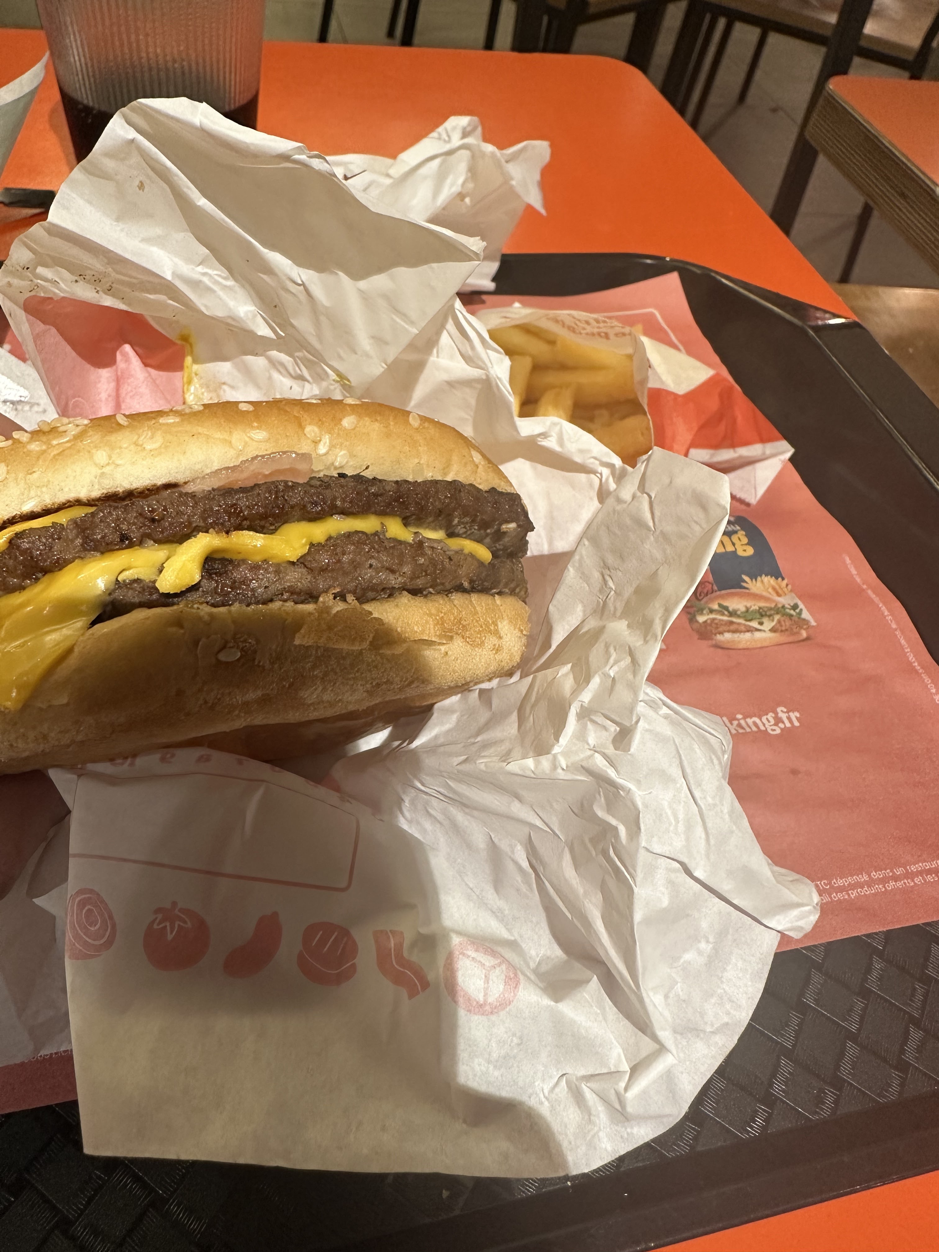 Bonjour, je suis allé manger au Burger King à la Rochelle. Jeudi dernier, j’ai bien mangé malgré que que j’ai trouvé très bruyant au niveau de la salle. Je trouve que c’est un peu gênant de monter les escaliers quand on a des difficultés à marcher comme moi et je n’ai pas voulu déranger le personnel pour demander à ce qu’il monte mon plateau. car il c’était le Reuch. Après il y a l’ascenseur, mais j’étais pas trop sûre d’être capable de tenir mon PLATEAU avec la boisson à l’ascenseur. Après il est bien situé pour ceux qui sont à l’université convient plus aux jeunes qu’au personne d’un certain âge. Mais j’ai quand même bien mangé c’était sympa, je recommande malgré tout ambiance très jeune. JEAN-LUC.