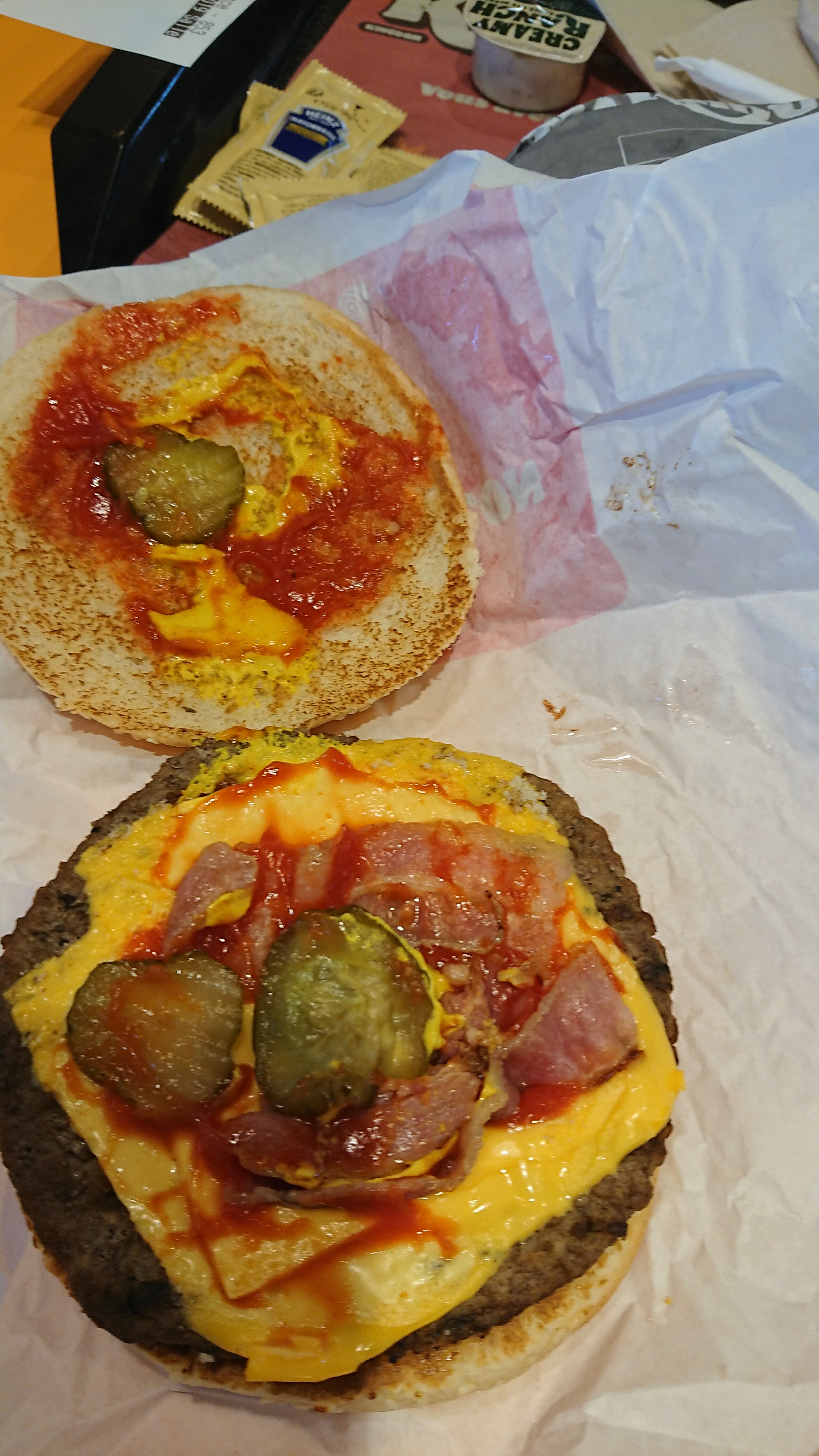 Pas de cuillère pour la glace, pas de fourchette pour les frites cheddar bacon. Portion cheddar bacon ridicule, le prix augmente et la quantité baisse ! Je veux bien qu'il y ait des doses mais la c'est de l'abus, on paye 1,50€ de supplément et on est loin d'en avoir pour notre argent, et en comparant avec les autres Burger King, on est inférieur ici au Pontet , radin par d'autre mot. Sans oublier ce dégueulasse cœur de salade au milieu de mon hamburger, un lapin s'aurait étouffer avec. Dommage que la photo ne s'affiche pas.
