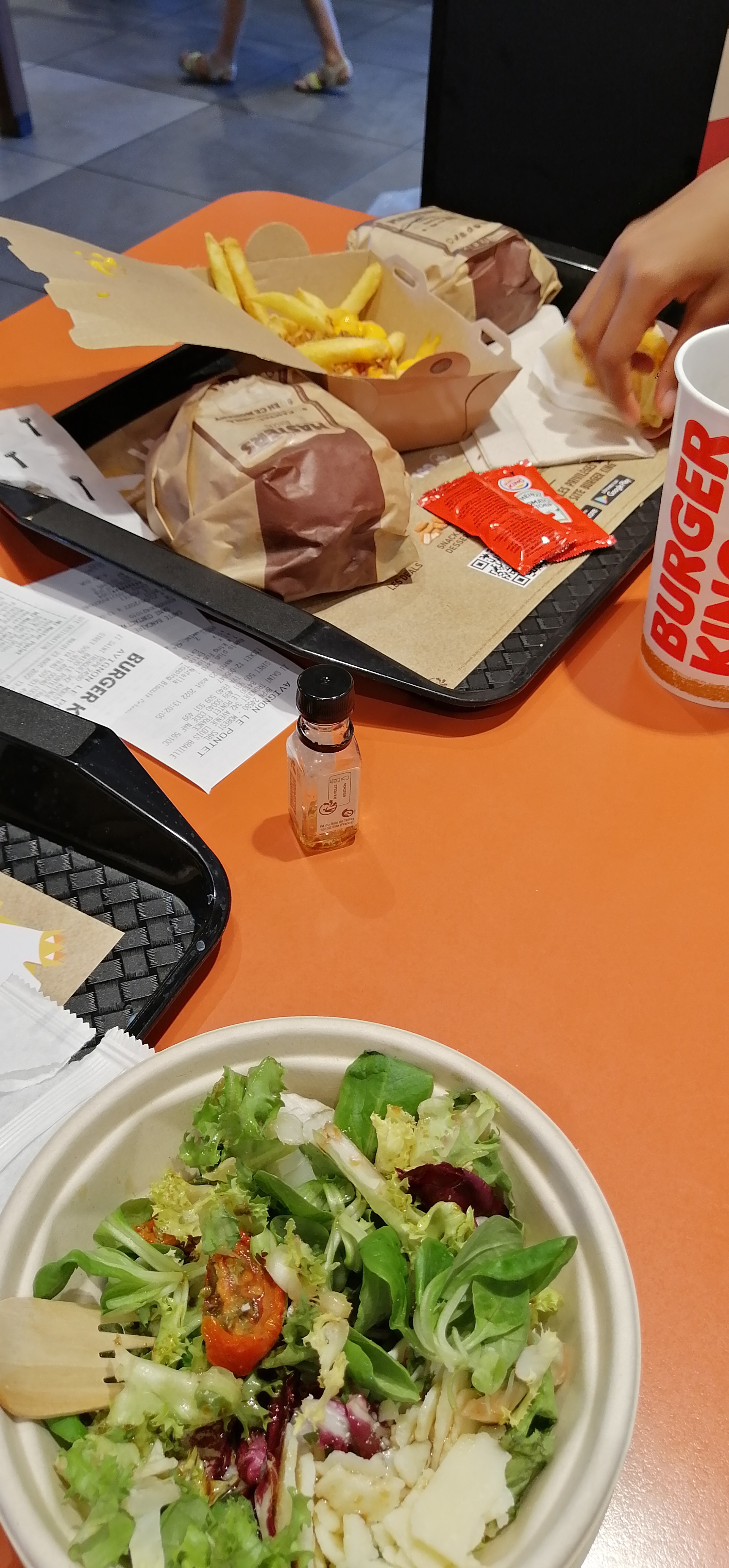Le restaurant est grand, la salle est propre et une personne passe régulièrement pour nettoyer les tables et le sol. Service rapide. Pas d'erreur dans la commande et on mange bien un Burger King. Le frites avec cheddar et bacon c'est top. Une étoile en moins car c'est dommage de ne pas avoir le service à table, on s'habitue vite à être servis 🙂