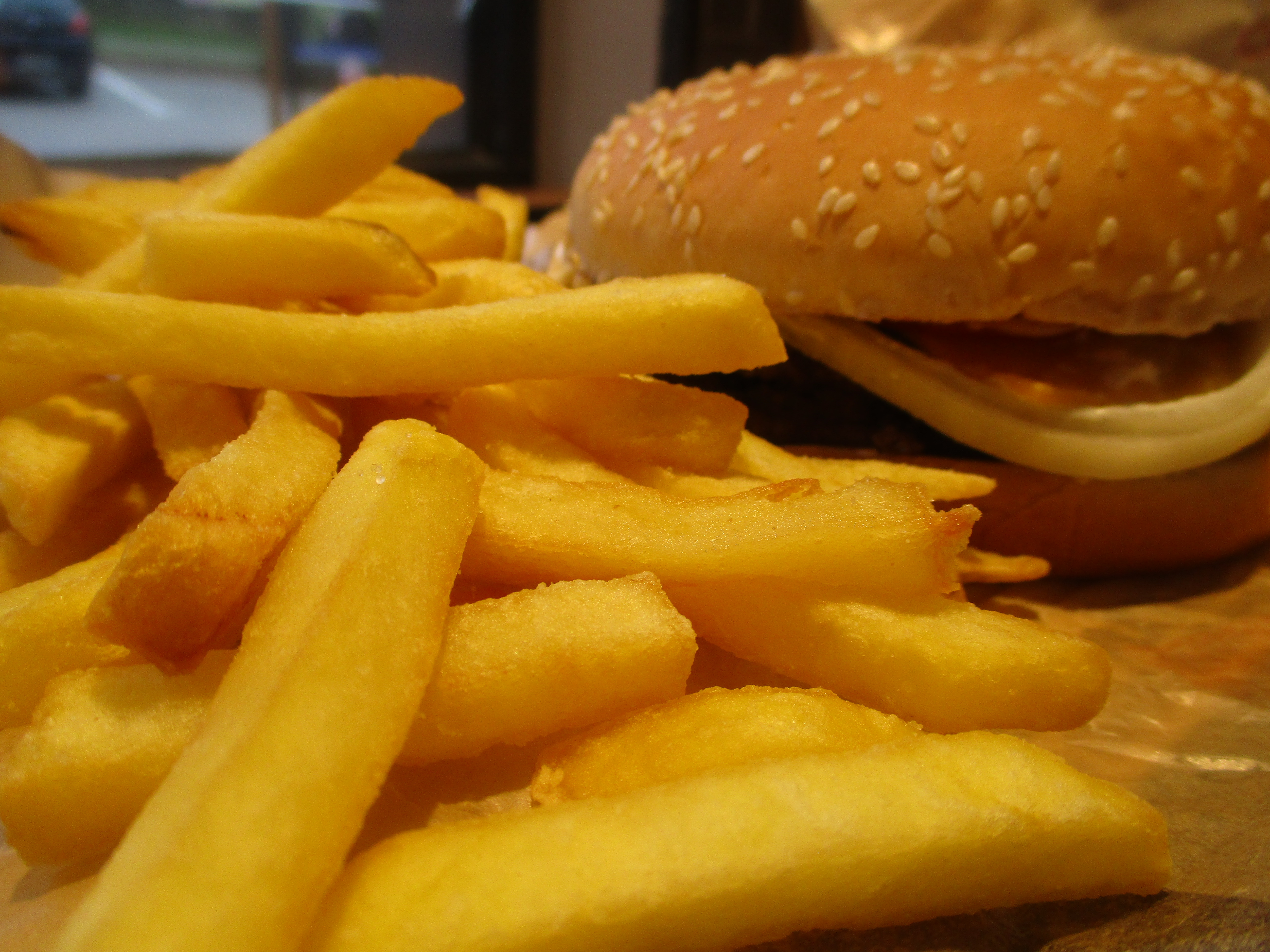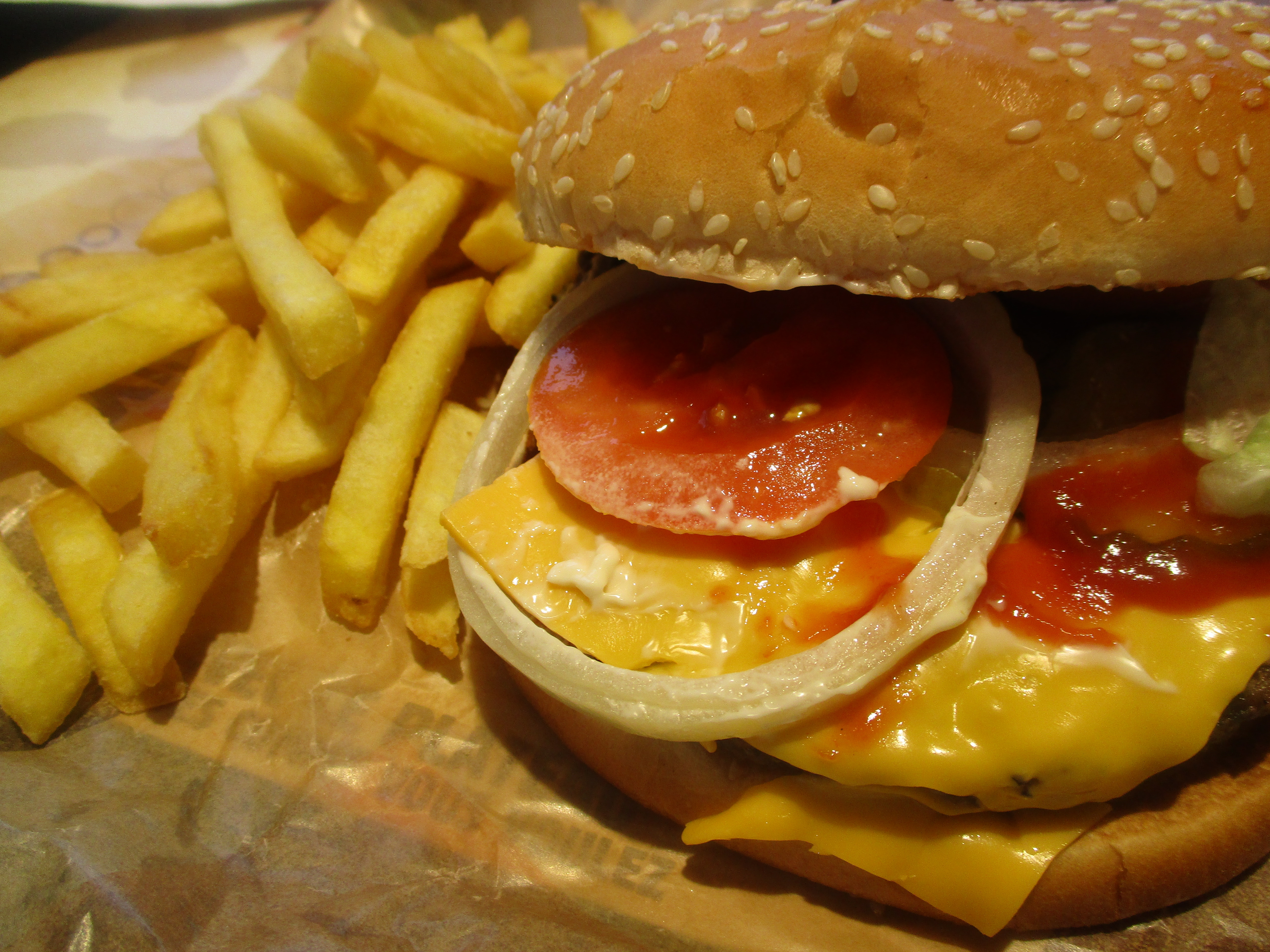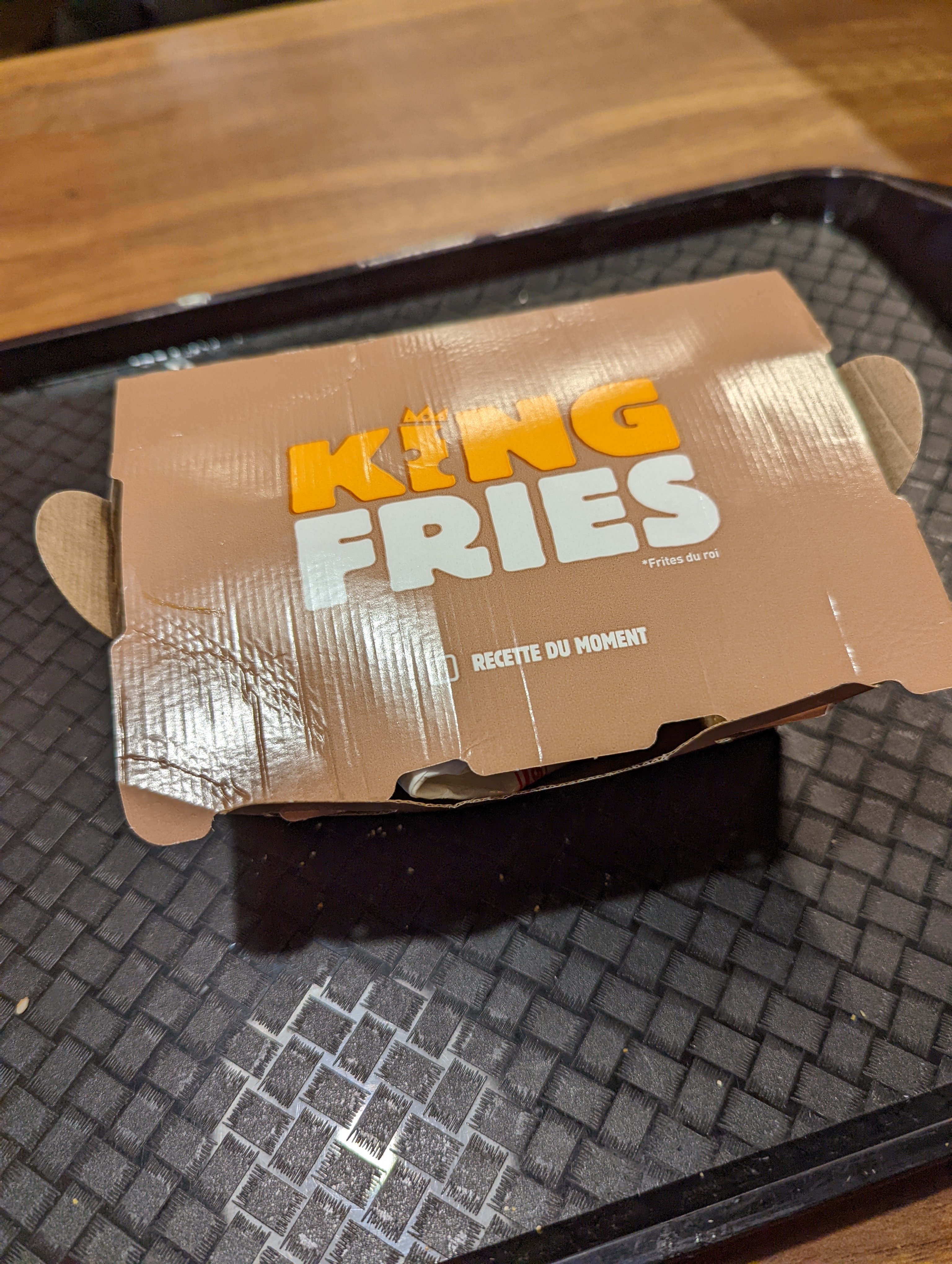 un menu grande taille acheté et là tu te rends compte que les frites chez Burger King doivent coûter très cher vu la petite quantité qui est servie. Après tu prends une sauce payante qu'ils ne te mettent pas dans le sachet,du coup tu y retournes et là ils t'en mettent 2. Idéalement elles devraient être gratuites et non oubliées...