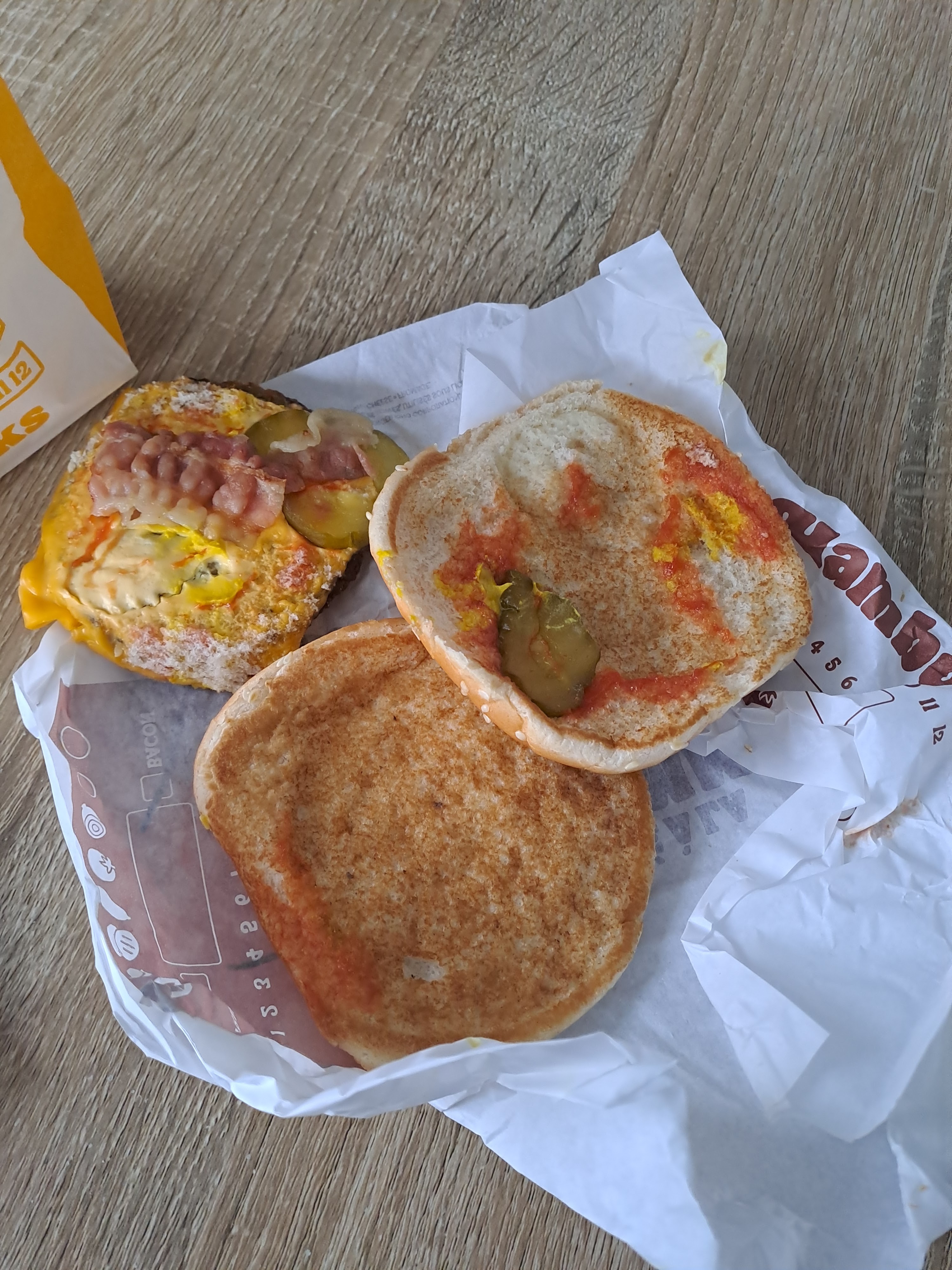 Burger incomplet. Il manque des tomates, la salade, les oignons. Tu t'en rends compte chez toi.... s'il faut en plus vérifier dans le burger s'il y a tout c'est vraiment contraignant. Le temps d'attente est long. Bref, cette commande a été la goutte de trop , je n'y retournerais plus. Quand tu payes 12 euros ton menu, autant aller se manger un bon ramen au japonais...