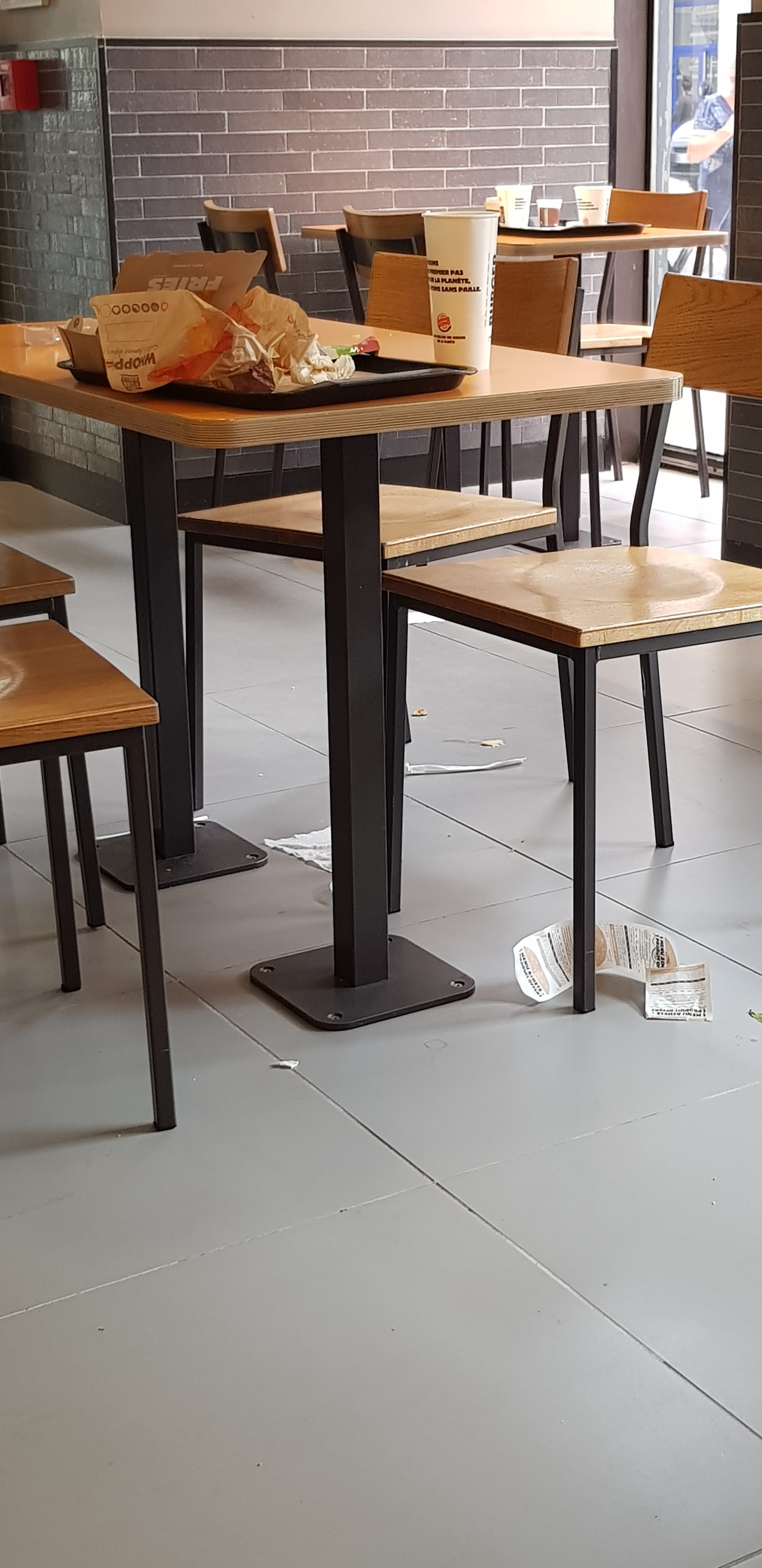 Service correct. Les King nuggets sont plutôt bon, frites ok, par contre, après avoir tester le whopper et steakhouse veggie, je ne suis pas convaincu. Gros bémol !!! Il faudrait penser à nettoyer en salle, il doit manquer de personnels car les tables ne semblent pas nettoyer. Il y a des miettes sur la plupart des tables, même les sièges pour enfants ne semblent pas nettoyer.