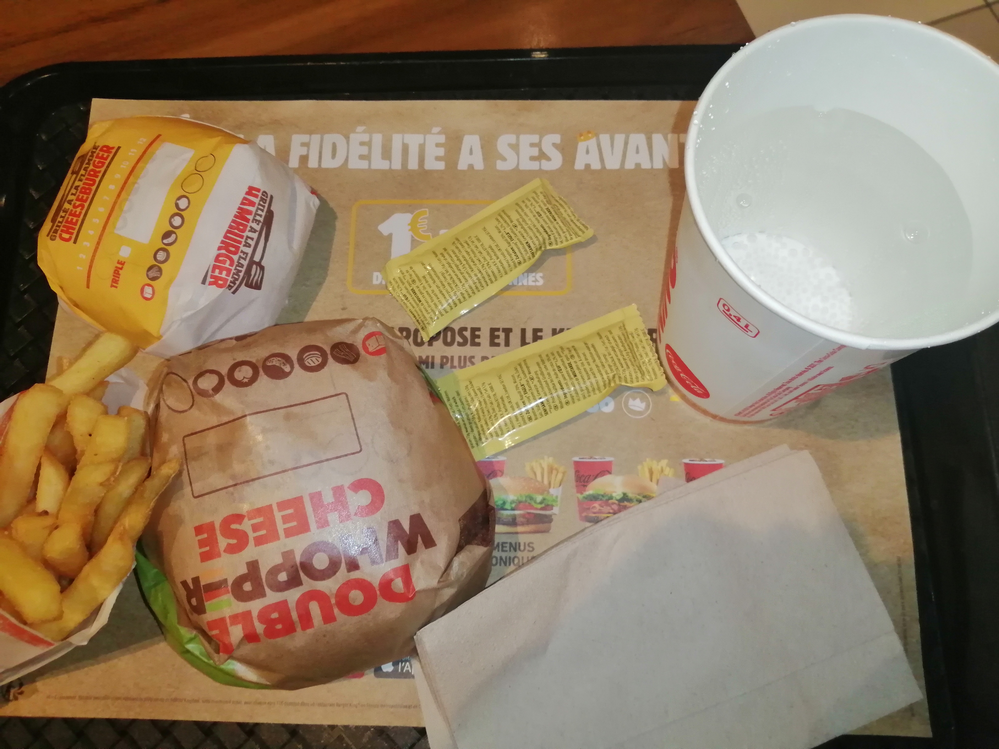 Burger King pas super propre, faudrait débarrasser les plateau et nettoyer les tables. Service rapide