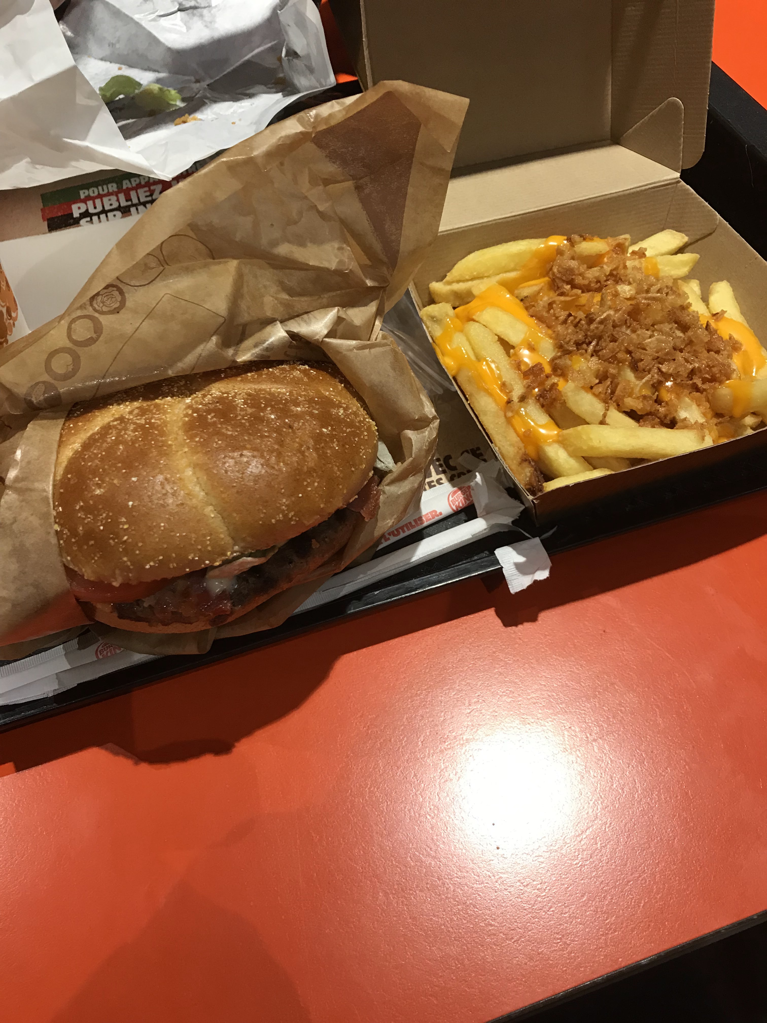 Ça relève le niveau. J’ai eu droit à un Wings en plus, les frites au cheddar en quantité, je suis repartie rassasiée comparé à d’autres fast-food. Possibilité de manger tard car servent en salle jusqu’à 23h et en drive jusqu’à minuit.