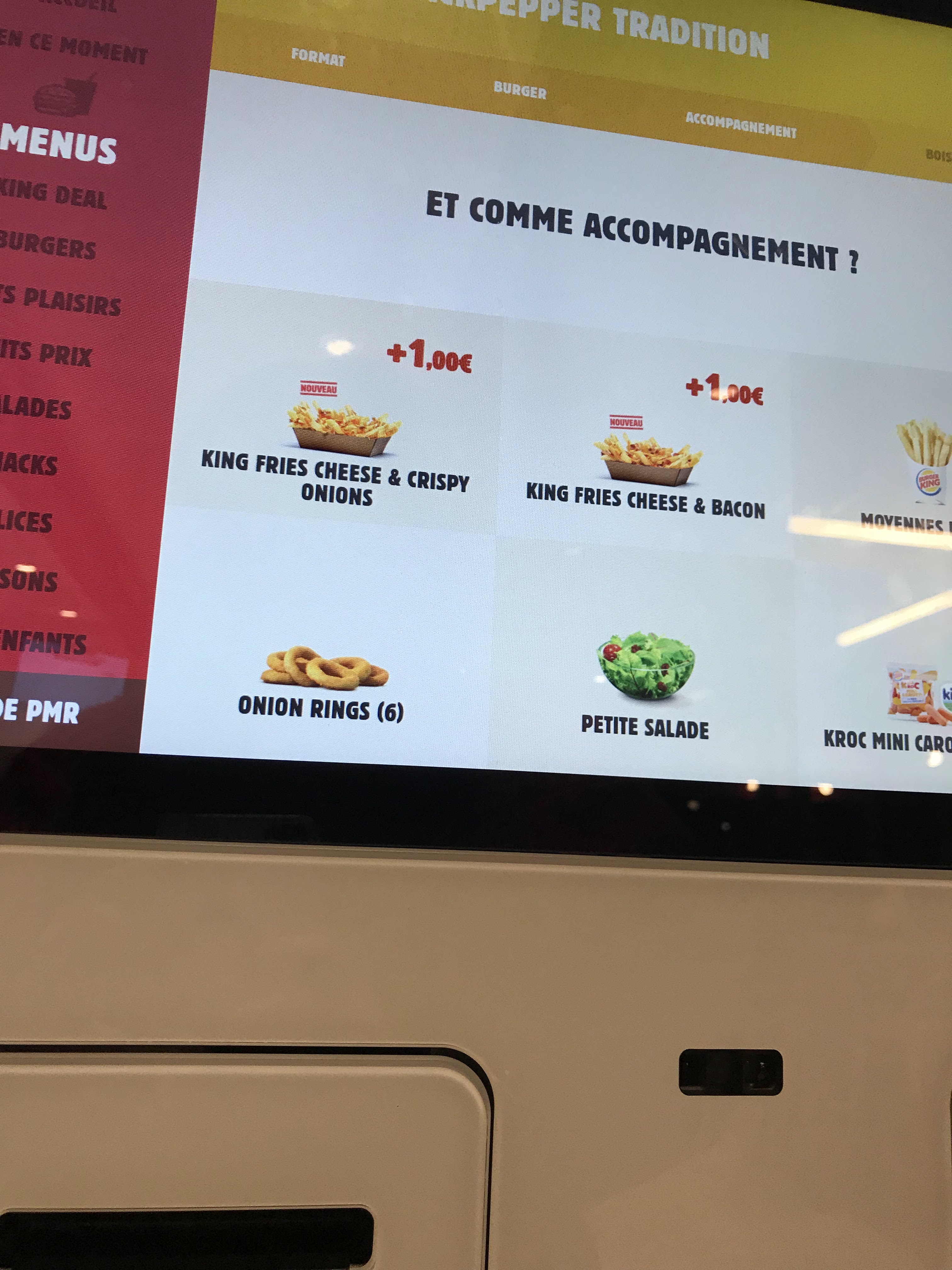 Trop d'attente : 25 minutes entre la commande à la borne et la réception de commande à emporter ( à 17h00 donc peu de clients ) ! J'ai fait remarquer qu'il manquait les onions rings, on m'a donné par 4 au lieu de 6 !