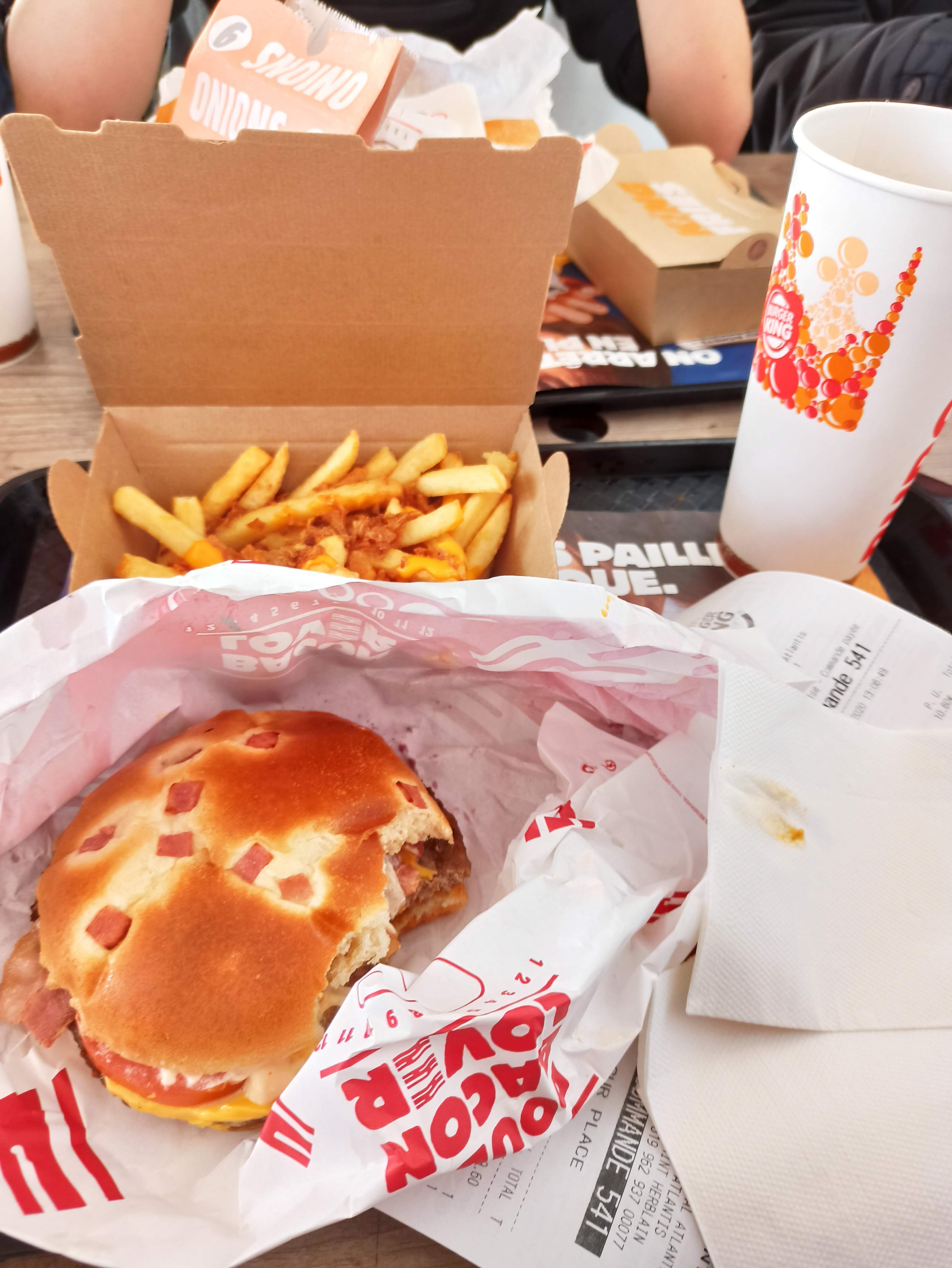 Bonjour C'était la première fois que je mangeais burger king La cuisine était bonne ça reste un fast food mais pour passer la faim c'est très bien mais le service et la propreté et exécrable si il mette autant d'attention sur la salle que en cuisine alors c'est juste dégueulasse le service et pas mieux pas de chevalet on te crie dessus pour venir chercher ta commande c'est pas mon kiffe surtout que de ce que je voyais les employés était pas a fond malgré le monde qui attendait Je suis déçu de ma première fois je n'y retournerai pas.