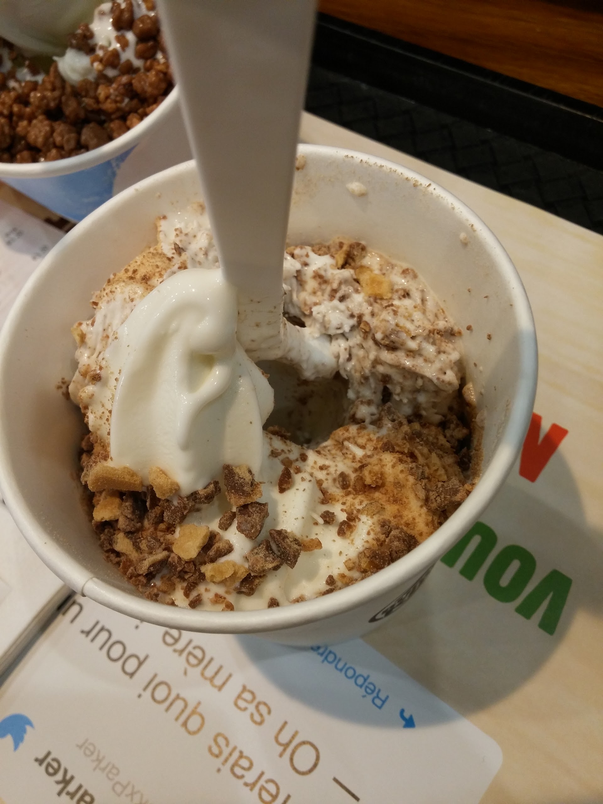 Commande à emporter conforme. Dommage cependant de ne pas avoir eu de cuillère pour les glaces. C'était plutôt compliqué. Je sors rarement avec mes petites cuillères