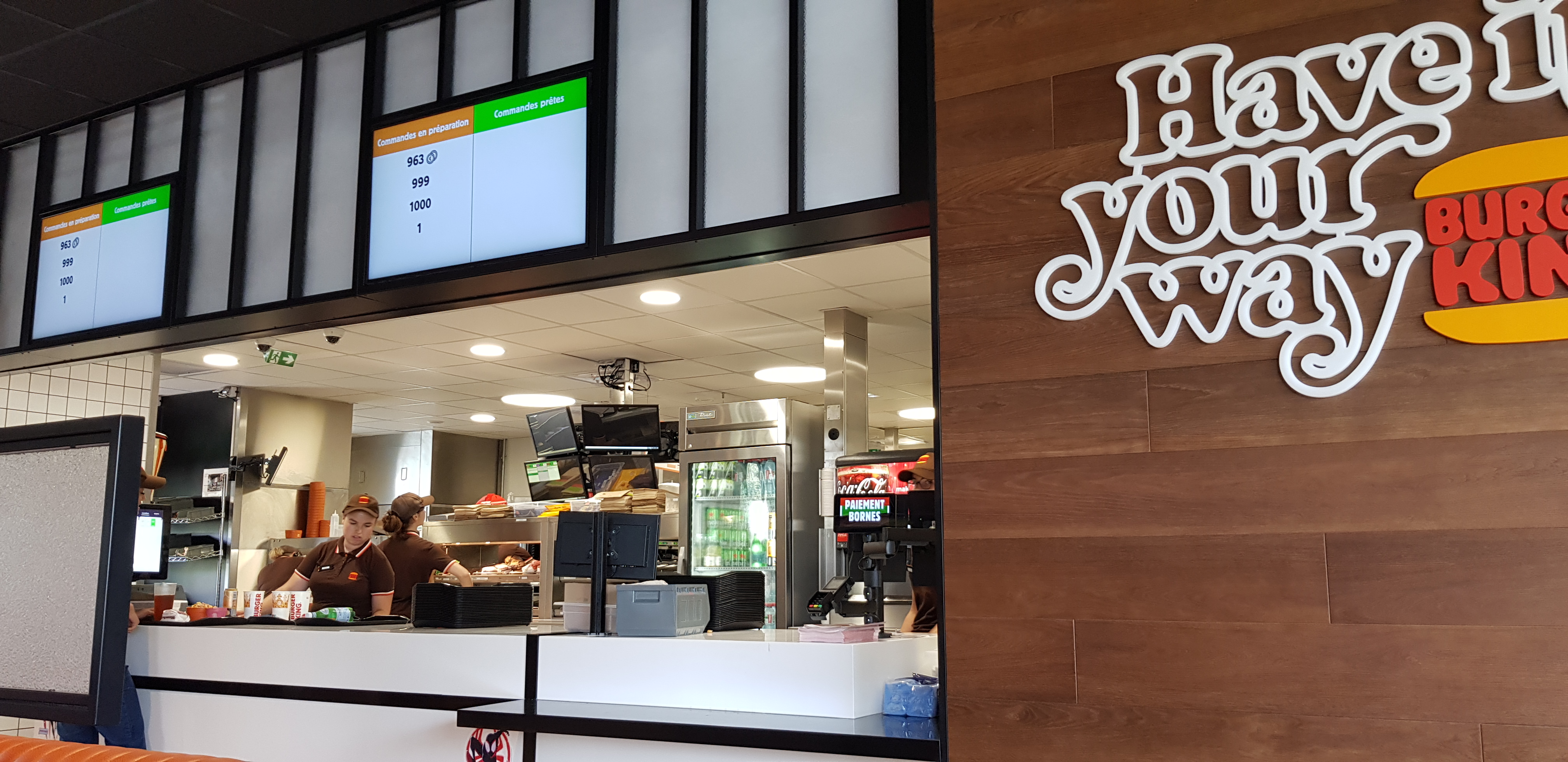 Commande à la caisse car les bornes ne fonctionnait pas là commande prête il a fallu aller la chercher sinon on aurait écore attendu malgré le code le compte fidélité pas pris en compte dommage