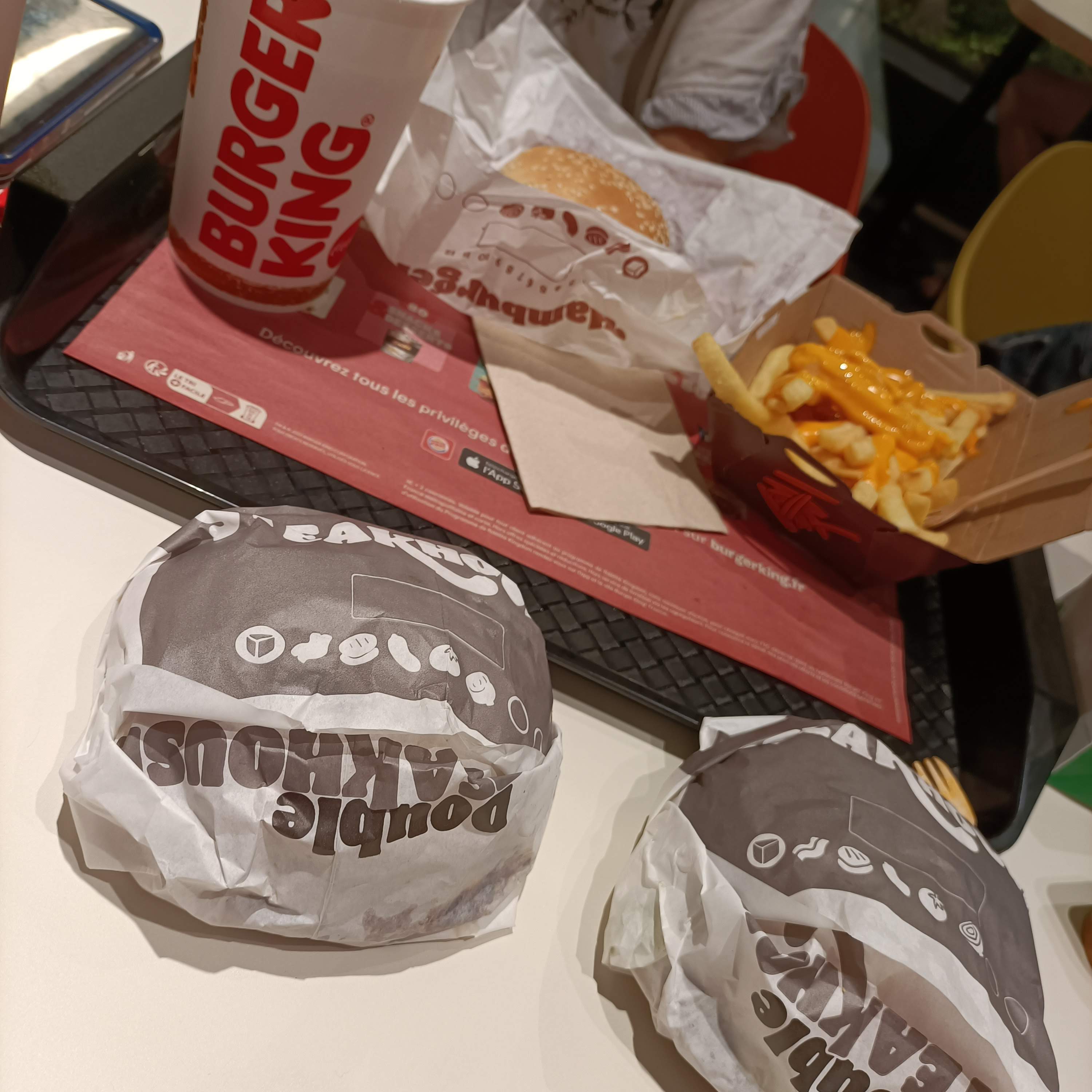 Un Burger King... Longue attente, vraiment longue. Sol sale avec papier, frites...Heureusement également qu'on a vérifié la commande parce qu'attendre une demi heure pour avoir au final un oubli. Et franchement, le goût et le visuel c'est pas à la hauteur du prix 😂