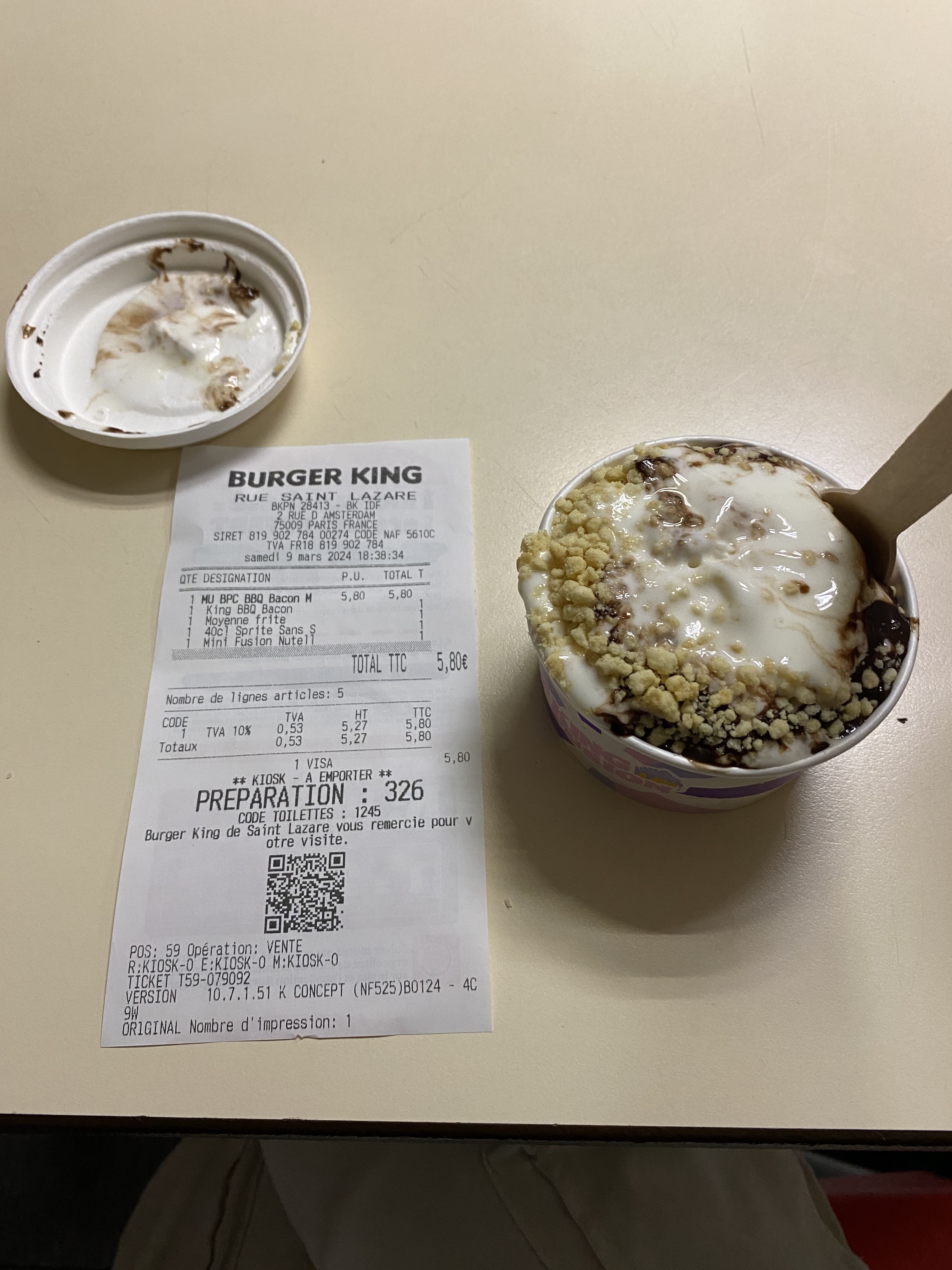 Nous avons attendu déjà une vingtaine de minutes avant d’avoir la commande, alors que tout le monde avant moi était servi et qu’il s’agit d’une petite commande. en plus de cela, j’ai commandé une glace mini King fusion au Nutella et j’ai reçu une mini King fusion au chocolat… les équipes étaient incompétente pour avoir déjà travaillé dans un Burger King. Celui-ci part à la dérive…