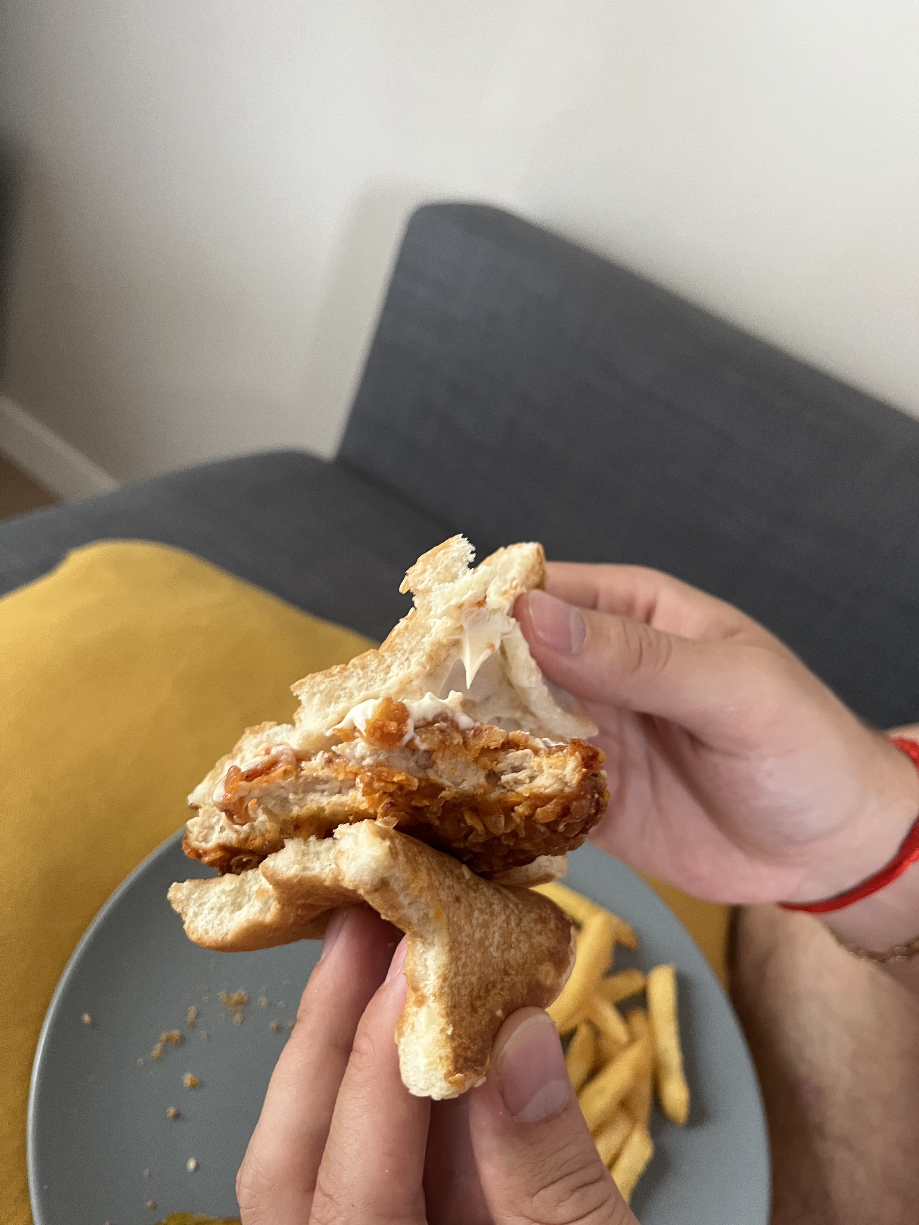 Dommage de payer 1 euros de plus pour les frites cheedar et d’avoir 3 frites dans la boîte. Sinon la commande était complète et sandwich chaud.