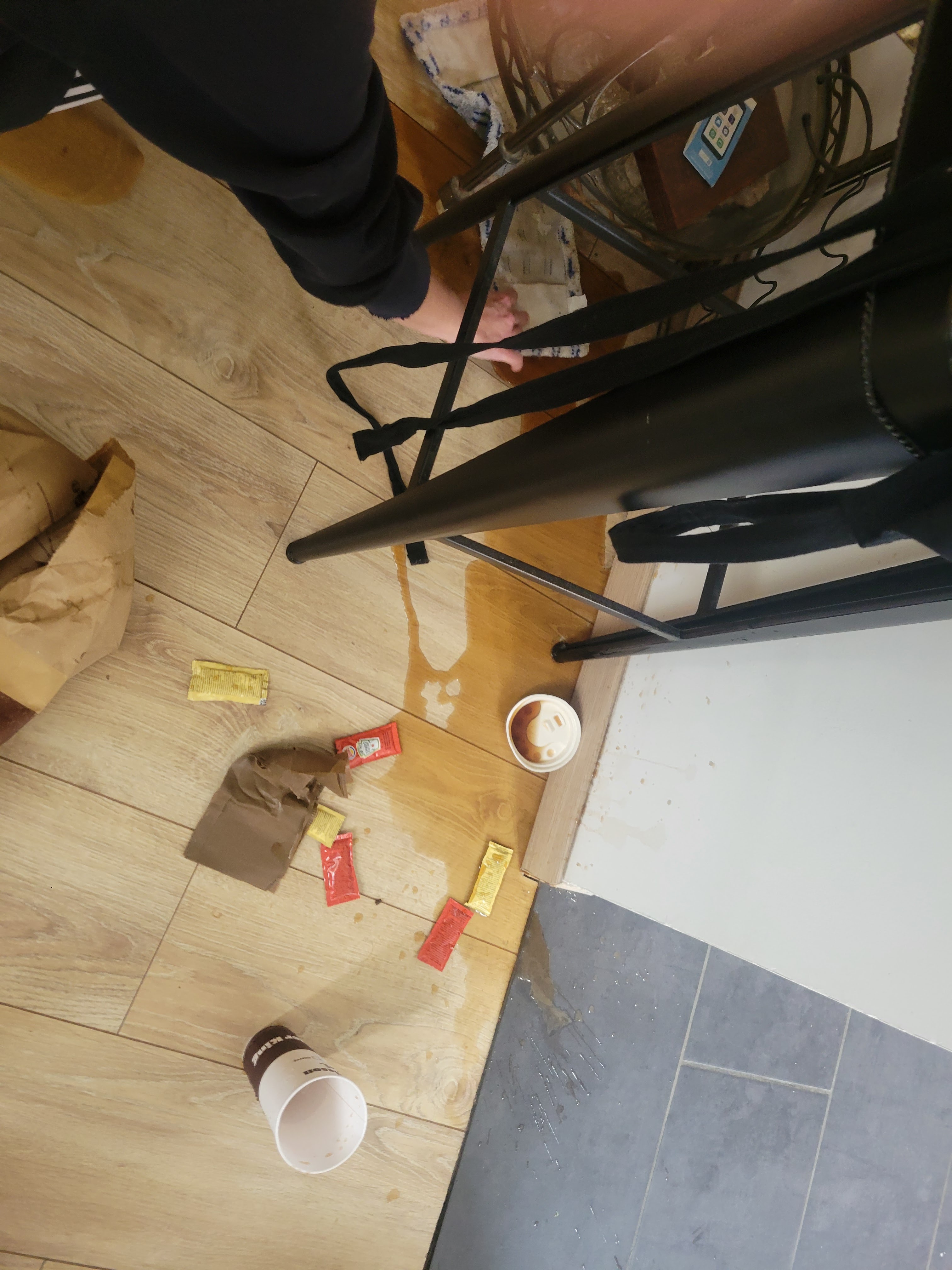 Table non nettoyée après le dernier client. Étant donné que ce n'était pas une heure de pointe avec un nombre limité de clients, la préparation de la commande prend beaucoup de temps. Les frites et les boissons étaient placées sur le plateau bien avant la préparation du sandwich, la température des deux n'étant donc pas idéale.